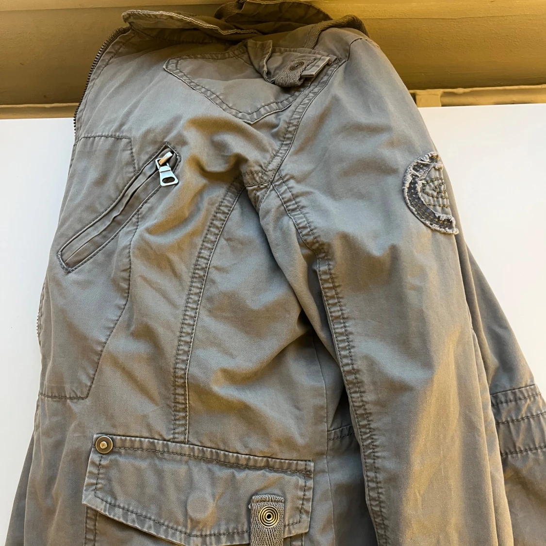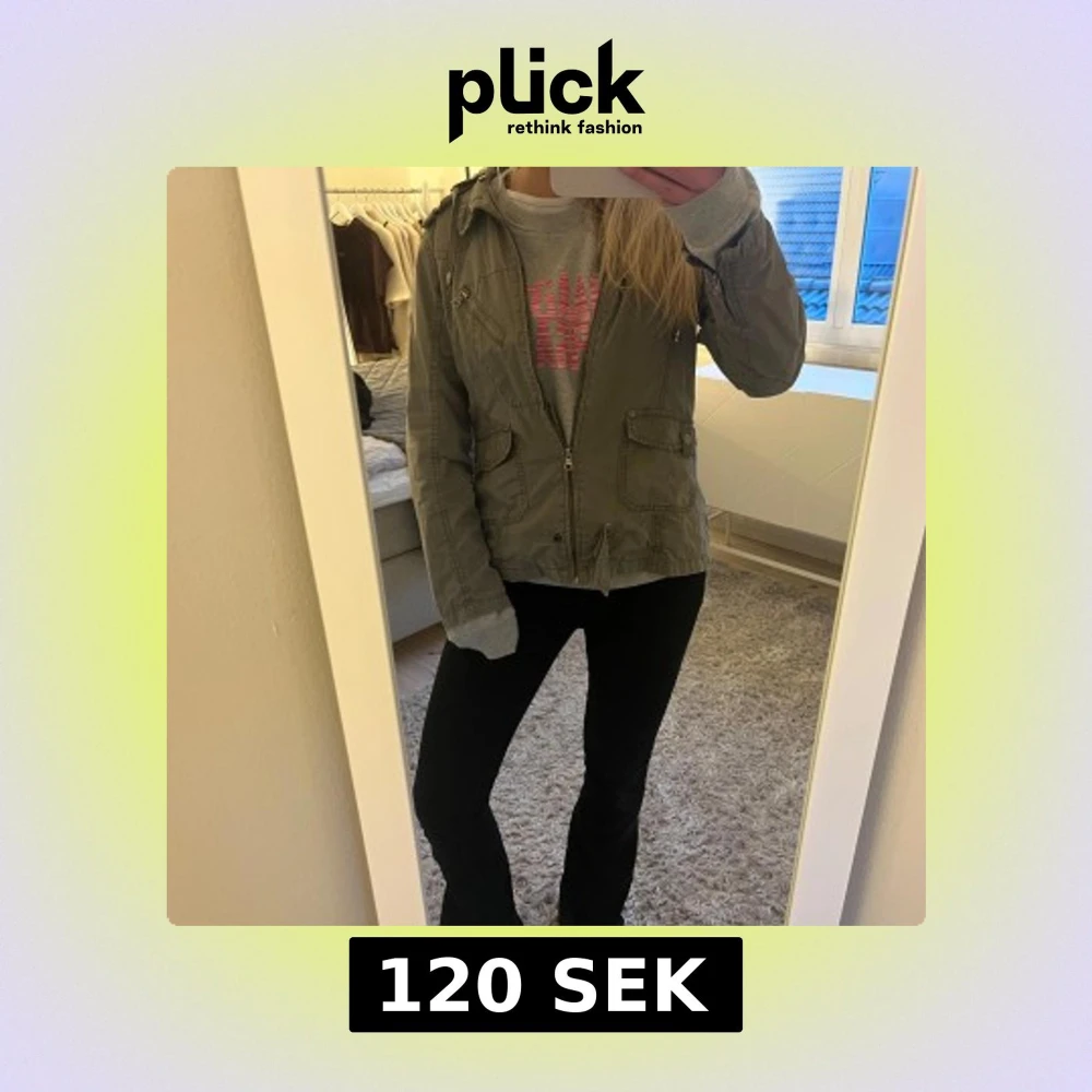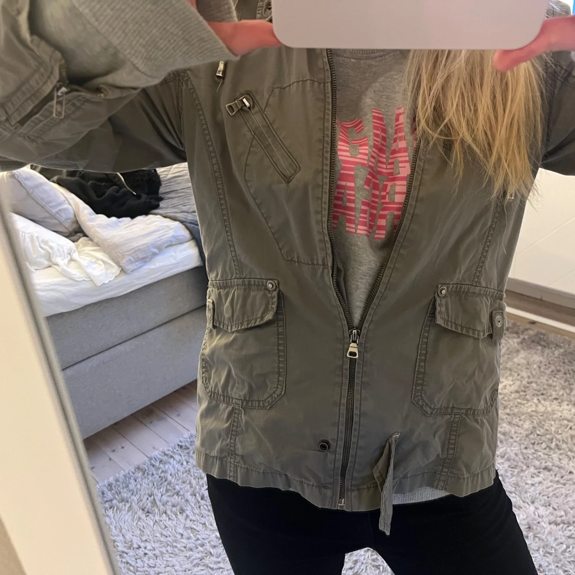 Säljer nu min militärgröna vårjacka då den ej används längre. Skriv för fler bilder! Det står att den är L i storlek men jackan är väldigt liten i storlek.
