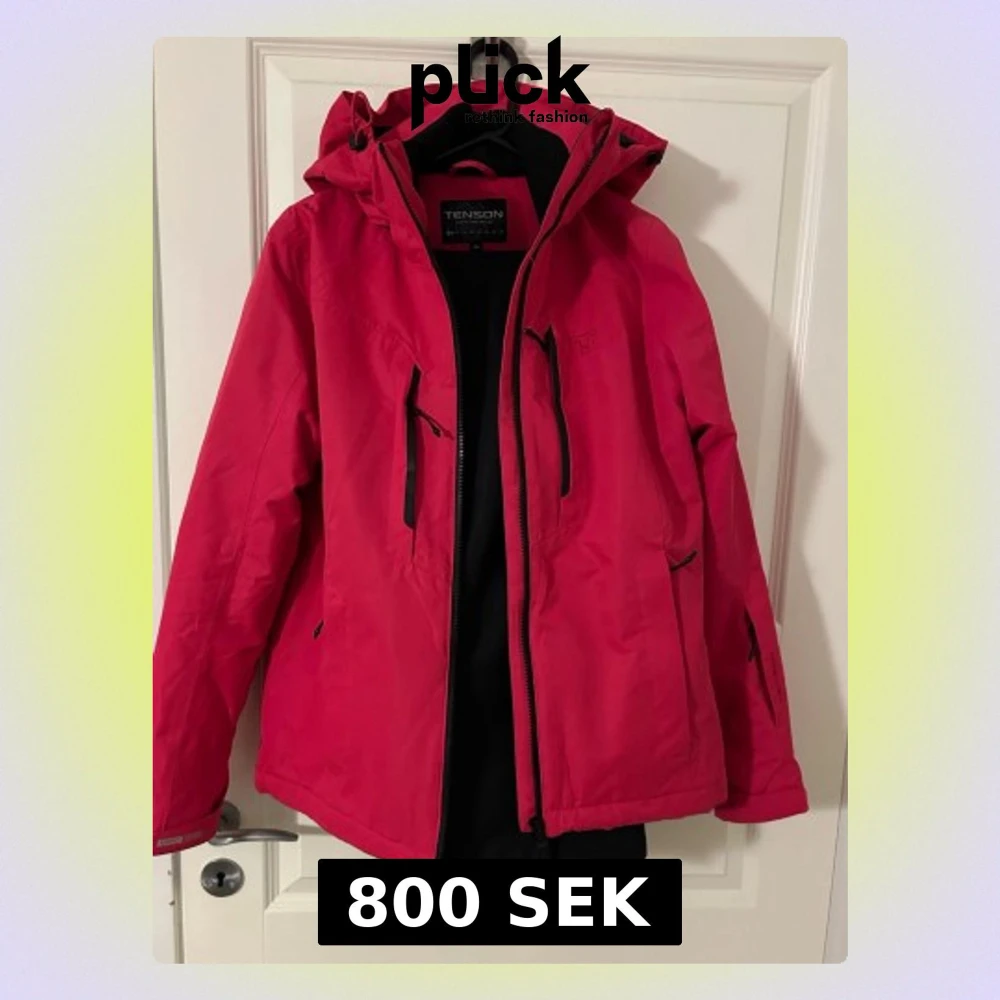 Snygg röd vindjacka (strl 40) från Tenson med justerbar huva och svarta dragkedjor. Jackan har flera praktiska fickor framtill och väldigt mjuk och skön på. Matchande skidbyxor i svart (strl 42). Mkt fint skick!