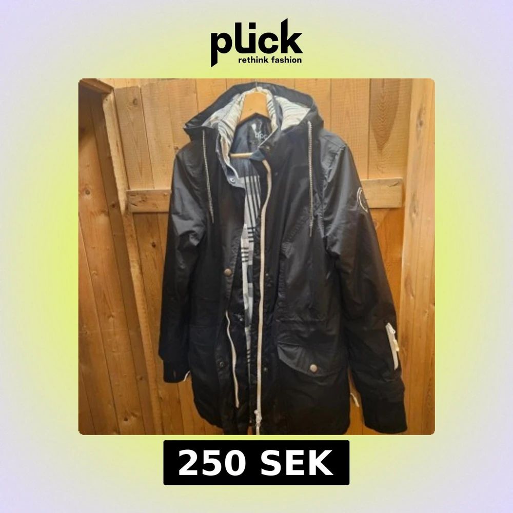 Svart parkajacka från bpc med vit dragkedja, stora fickor och justerbar huva. Jackan har ett rutigt innerfoder i beige, svart och grått. Snygga detaljer och patch på ärmen. Perfekt för kyliga dagar.