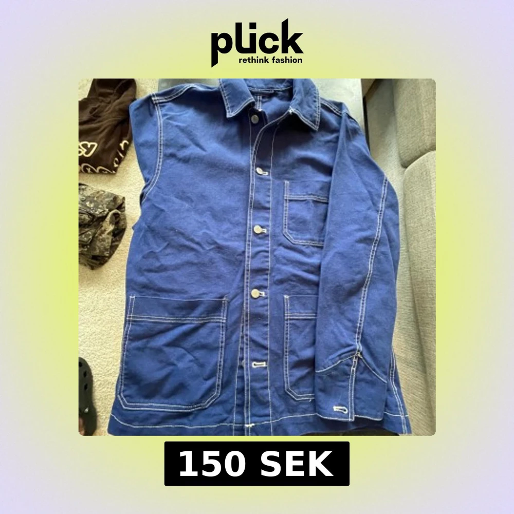 Säljer en blå väst med tydliga vita kontrastsömmar och stora fickor framtill. Västen har klassisk krage, knäppning med silverfärgade knappar och en bröstficka. Materialet är bomull och modellen är rak och loose fit.