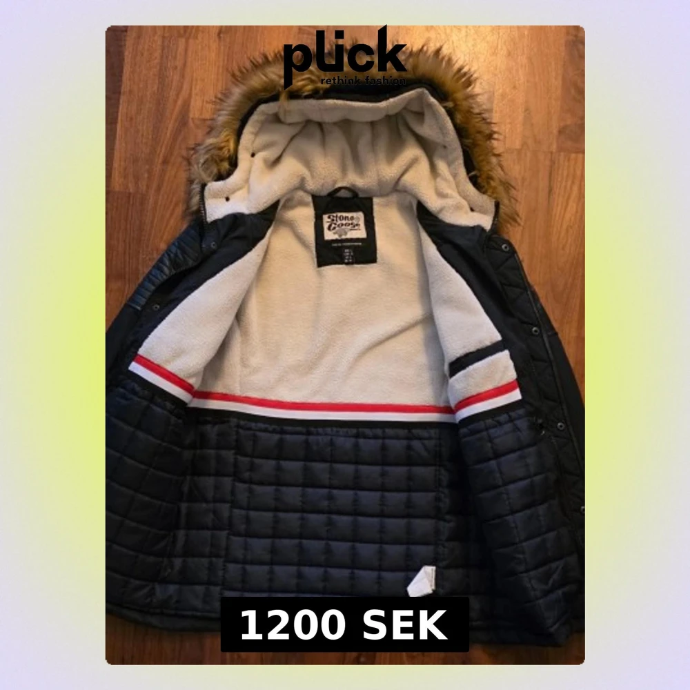Snygg svart parkas från Stone Goose med fuskpäls på huvan och quiltade detaljer på axlar och insida. Jackan har dragkedja och knappar framtill, flera fickor och ett varmt, mjukt innerfoder i vitt med röda och svarta ränder. Perfekt för kalla dagar.
