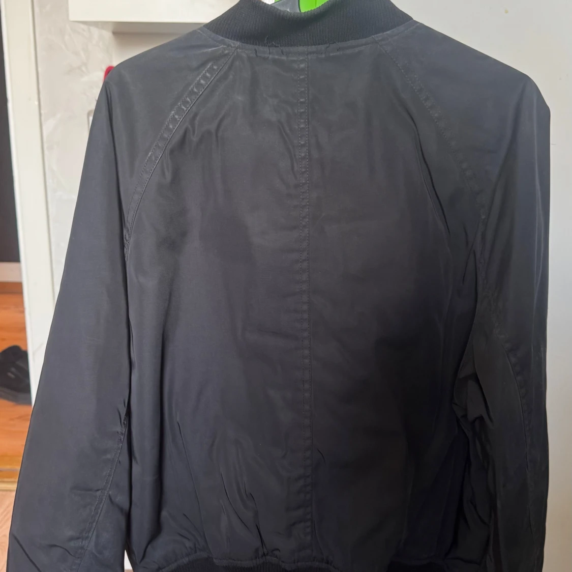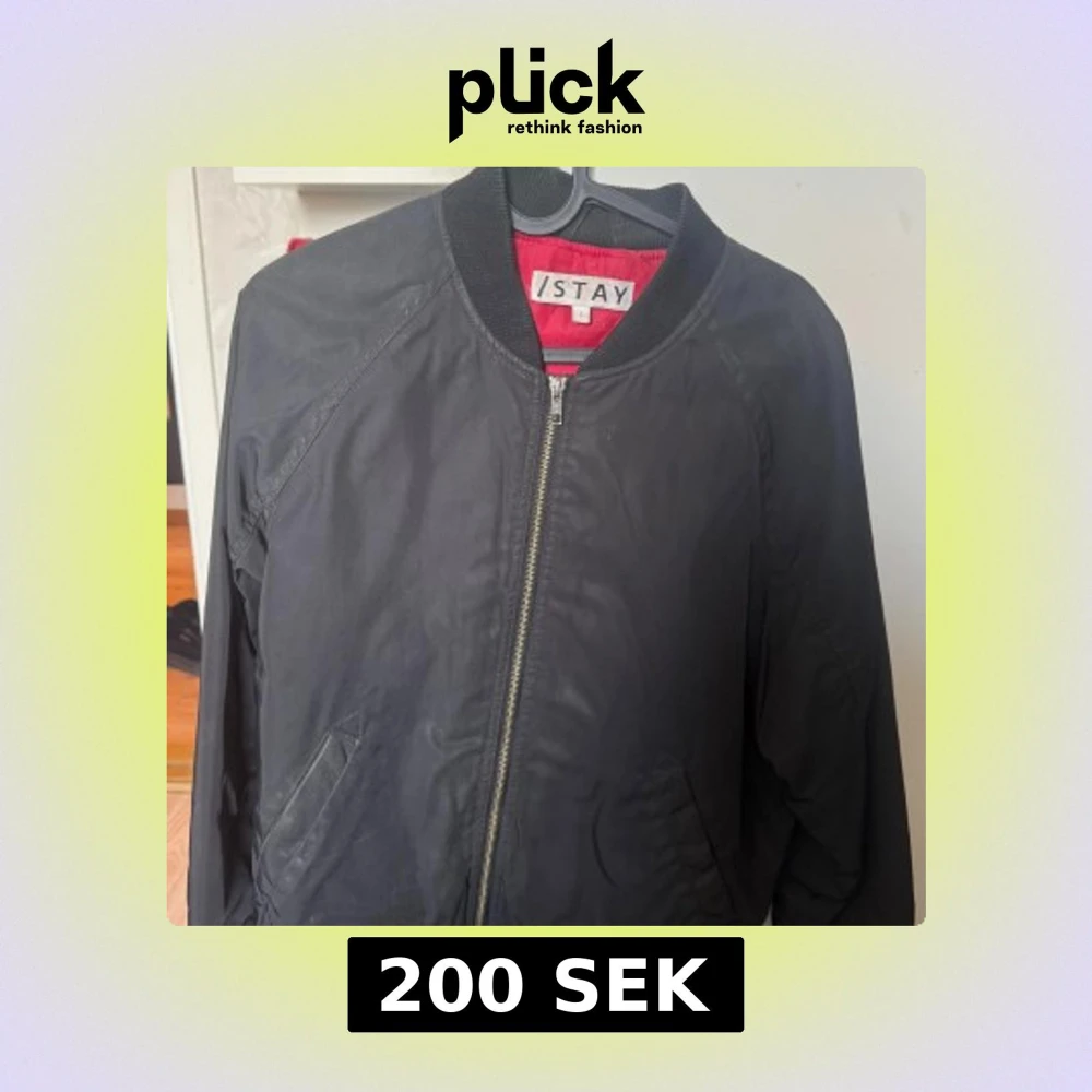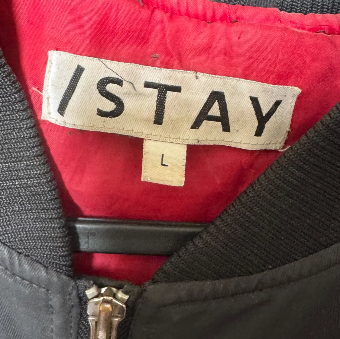 Säljer en stilren svart bomberjacka från ISTAY. Jackan har en dragkedja framtill och ribbade muddar vid krage, ärmslut och nederkant. Perfekt för en cool och avslappnad look.