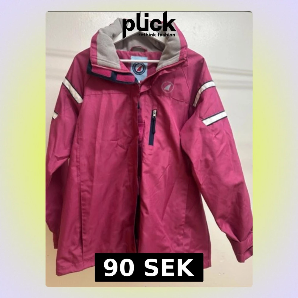 Rosa jacka med grå fleecefodrad krage och vita detaljer på ärmarna. Jackan har dragkedja och tryckknappar framtill, samt flera fickor med dragkedja. Perfekt vid mildare väder eller med fleece / tjocktröja under.