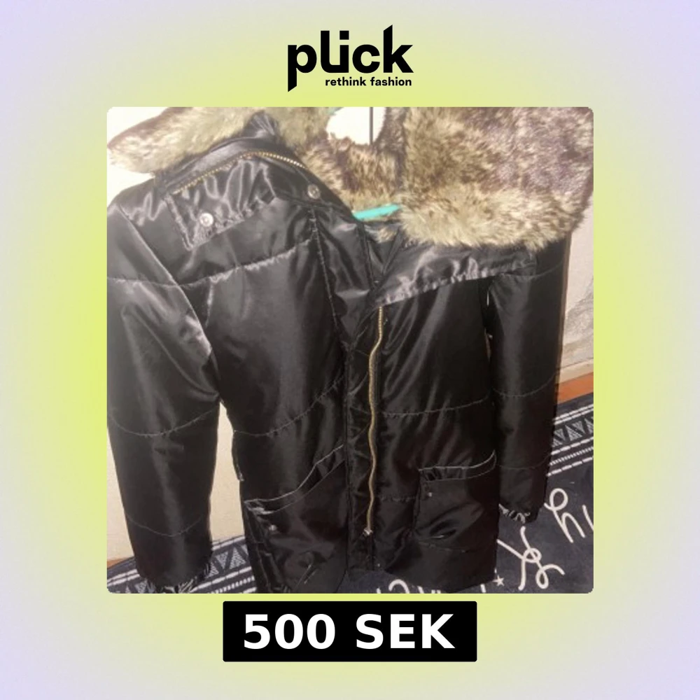Säljer en svart pufferjacka med stor fluffig luva i brunmelerad fuskpäls. Jackan har dragkedja framtill, två stora fickor med knappar och quiltade detaljer. Perfekt för kalla dagar när du vill vara både varm och snygg.