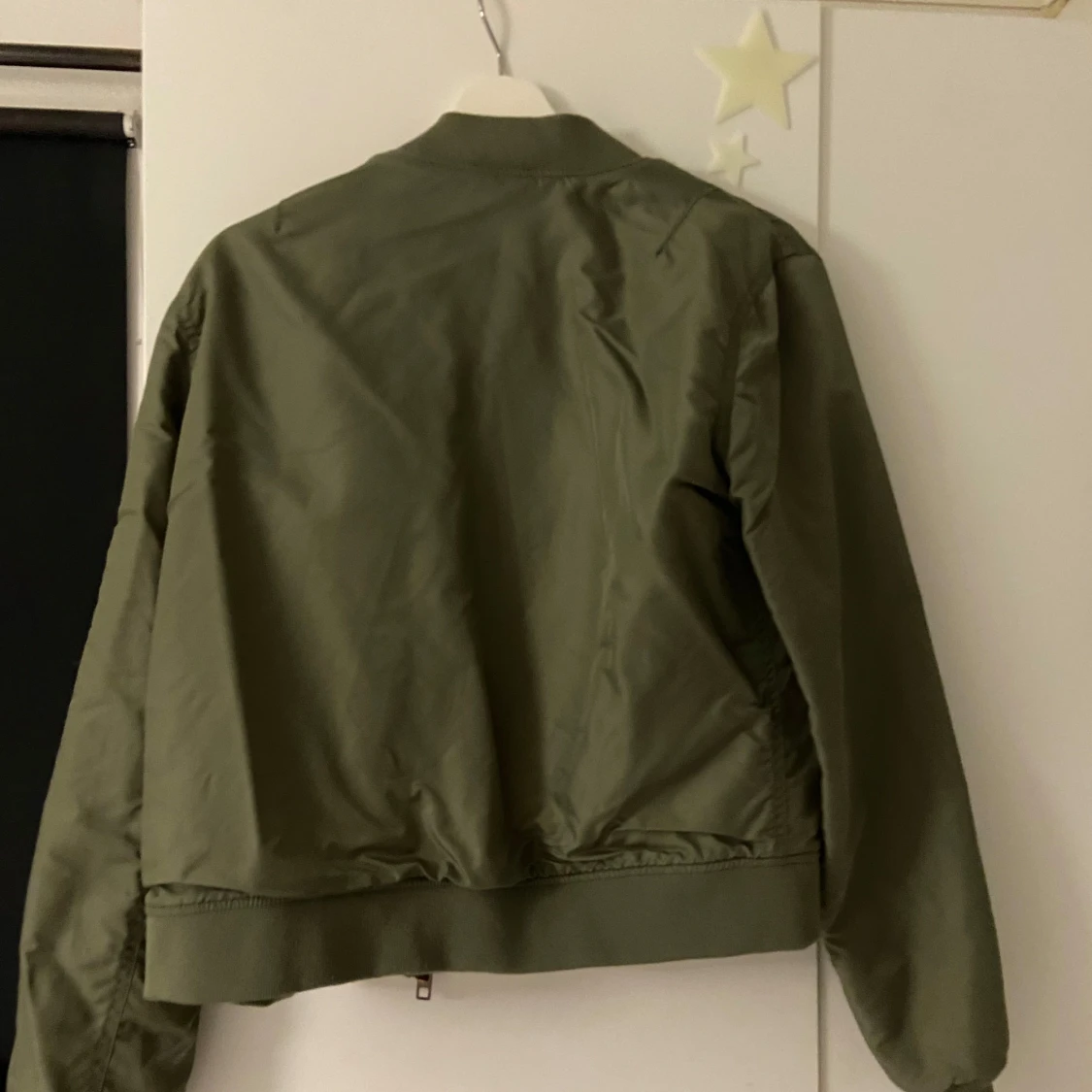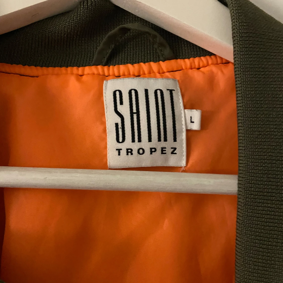 Snygg olivgrön bomberjacka från Saint Tropez med orange foder. Jackan har dragkedja framtill och en ficka med dragkedja på ärmen. Perfekt för en cool och avslappnad stil.