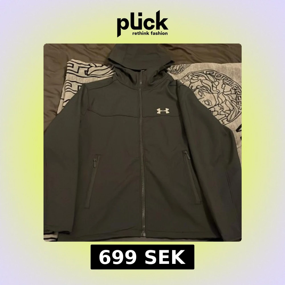 Säljer en svart jacka från Under Armour med huva och dragkedja. Jackan har en stilren design med två fickor framtill och är tillverkad i ett vattentätt material. Perfekt för utomhusaktiviteter.
