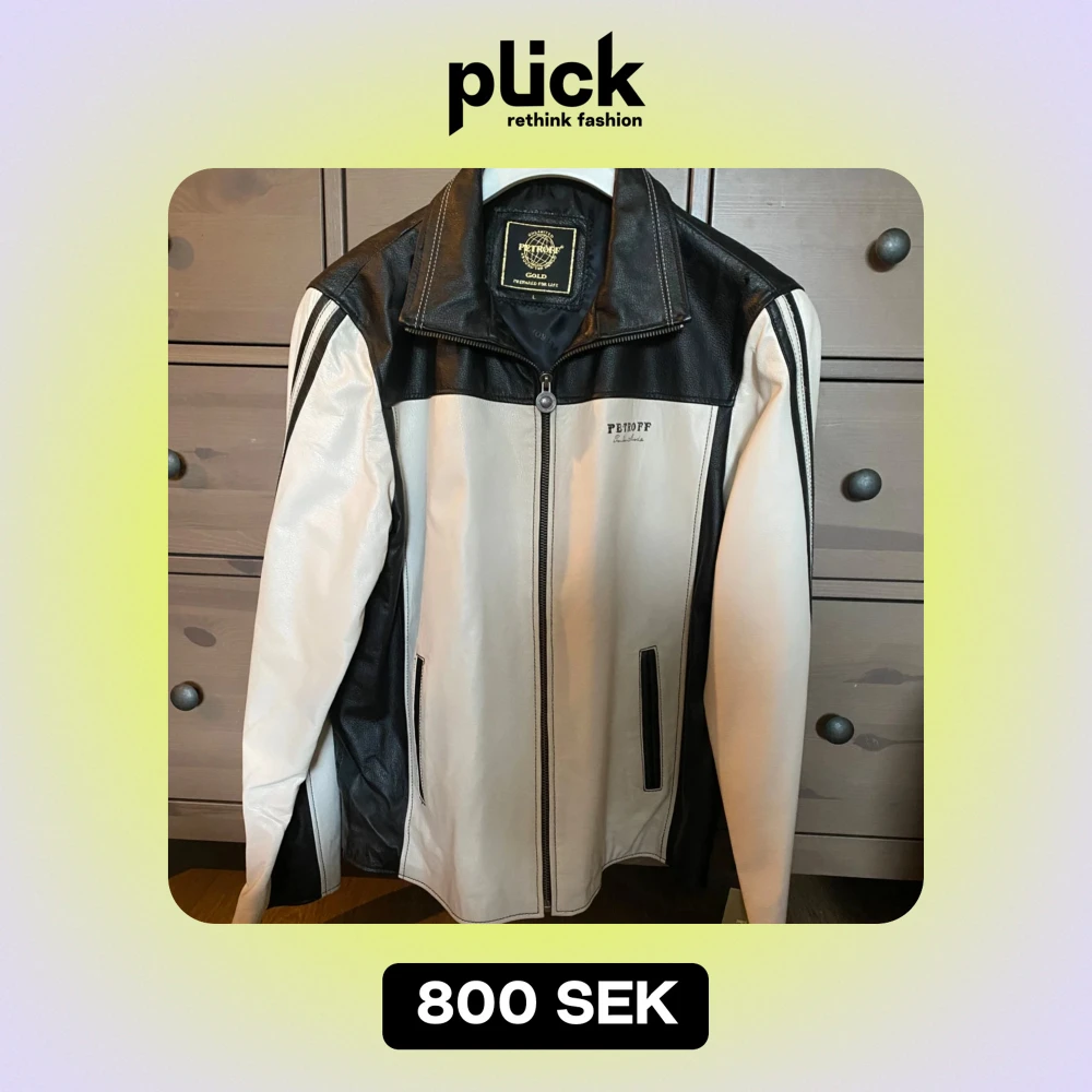 Säljer en snygg svart och vit skinnjacka från Petroff i storlek L. Jackan har en cool dragkedja framtill och stilrena svarta detaljer på ärmarna. Perfekt för höst och vår när du vill ha en stilren look. Den är ny och har lappar kvar på armen.