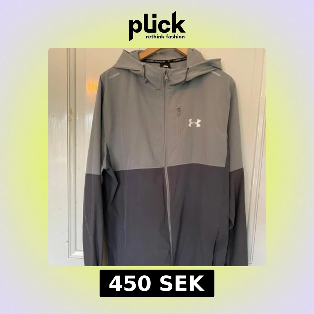 Snygg o trendig tvåfärgad grå vindjacka från Under Armour med huva och dragkedja. Jackan har en bröstficka med dragkedja och logga på bröstet. Perfekt för träning eller när du vill ha en sportig look. Köpt på JD sport för några månader sedan för 1200kr, endast ett litet hål vid armbågen som man kan sy