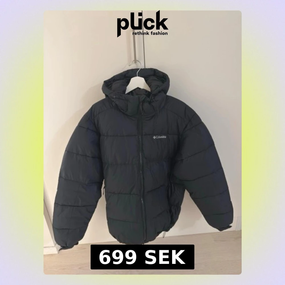 Svart pufferjacka från Columbia med huva och dragkedja framtill. Jackan har ett quiltat mönster och är tillverkad i syntetmaterial med en glansig insida. Nypris 2500kr. Knappt använd.