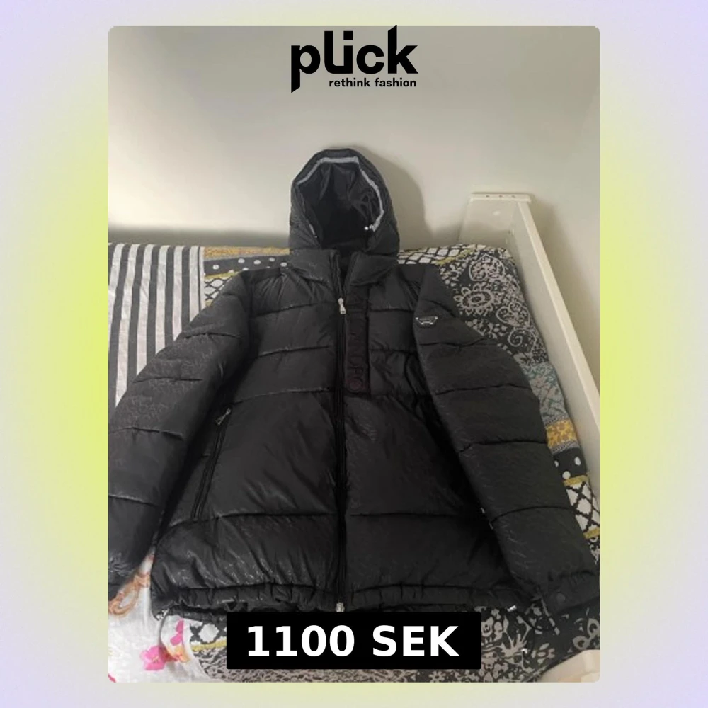 Säljer en svart pufferjacka från Alessandro Zavetti med huva och diskret logomönster över hela jackan. Jackan har dragkedja framtill, två sidofickor med dragkedja och en snygg badge på ärmen. Perfekt för kalla dagar när du vill hålla stilen.
