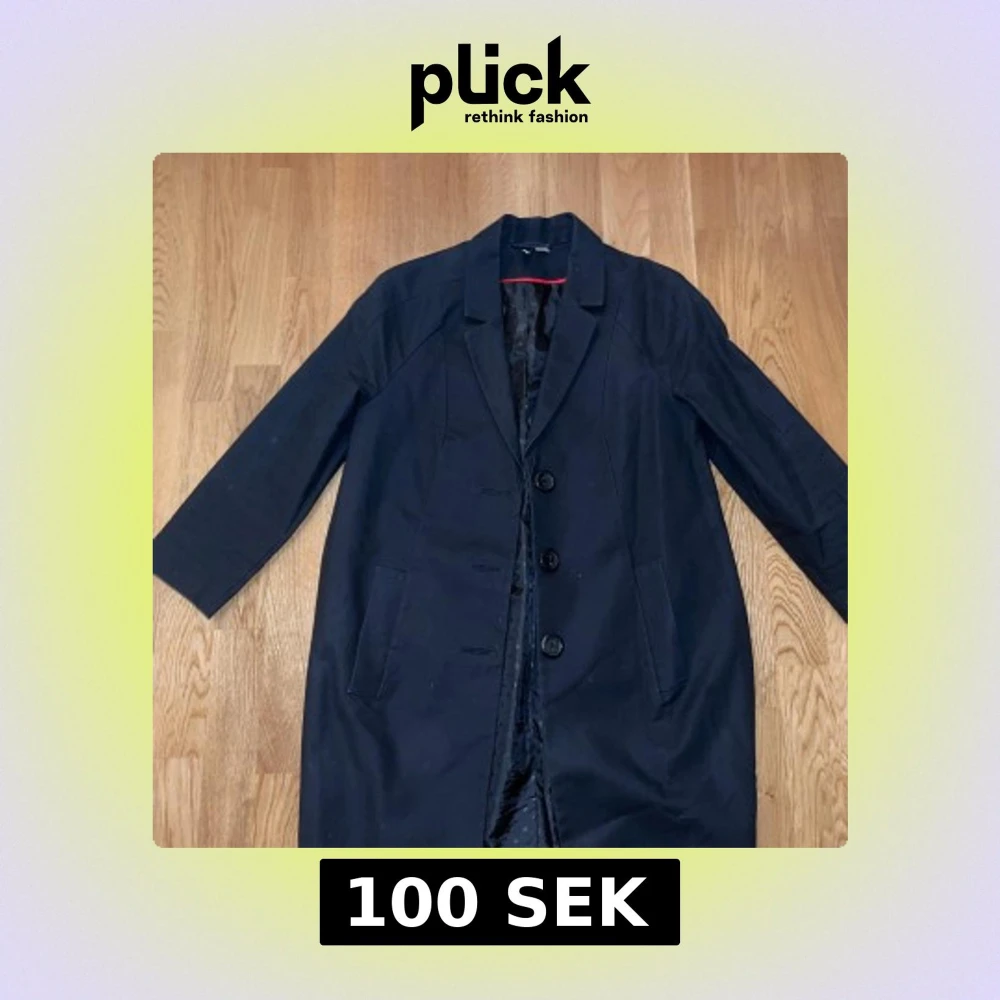 Säljer en svart kappa med klassisk krage och tre stora knappar framtill. Jackan har raka ärmar och två fickor på sidorna. Perfekt för dig som gillar en stilren och enkel look. Fodrad insida för extra komfort.
