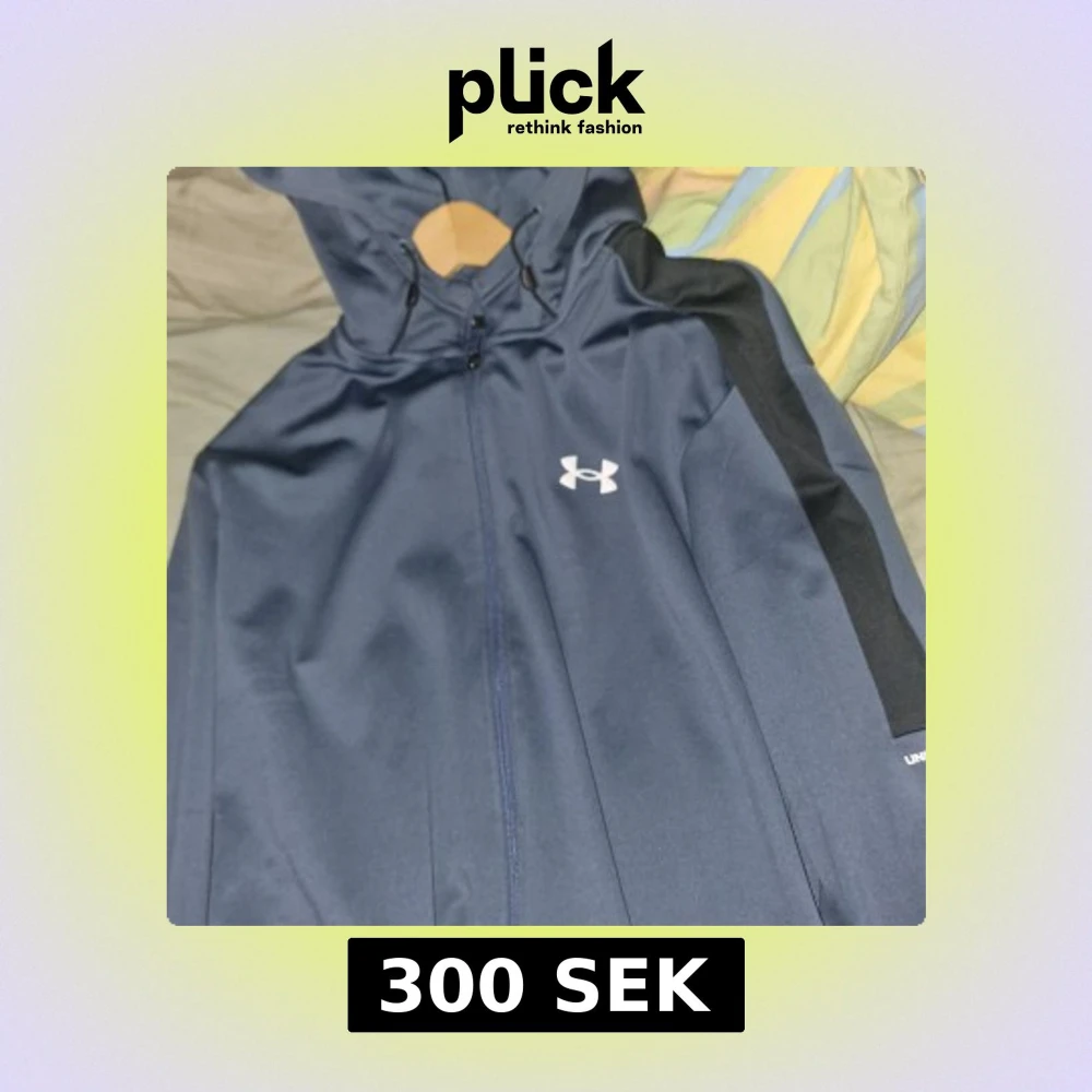 Snygg blå träningsjacka från Under Armour med svart detalj längs ärmen och vit logga på bröstet. Jackan har huva och dragkedja framtill, perfekt för aktiva dagar.