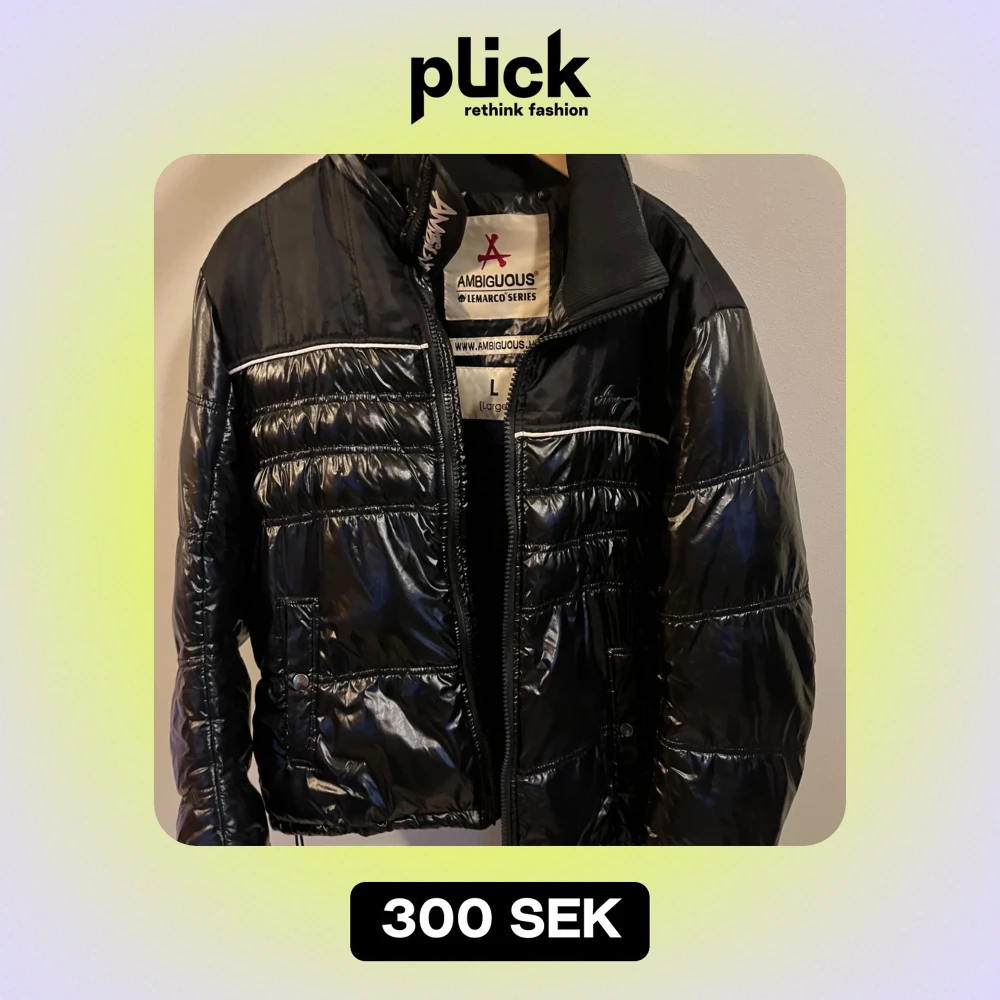 Säljer en svart pufferjacka från Ambiguous i mycket bra skick. Jackan har en glansig yta med dragkedja och hög krage. Perfekt för kyliga dagar och ger en cool look.