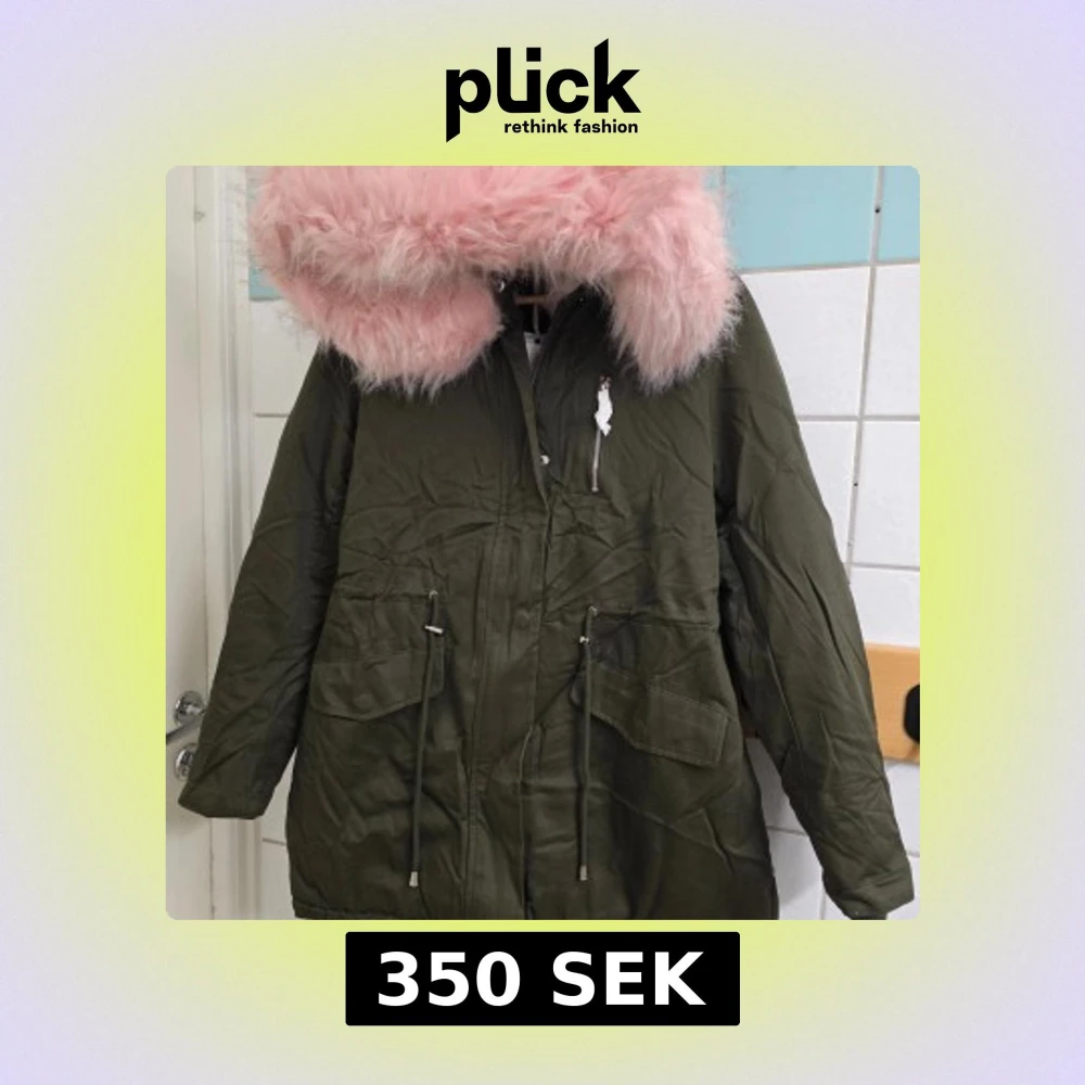 Parkasjacka i olivgrönt med stor huva och fluffigt rosa foder samt detaljer i vitt och svart. Jackan har snörning i midjan, dragkedja och flera fickor framtill. Insidan är mjuk och varm med pälsimitation i rosa, perfekt för kalla dagar.