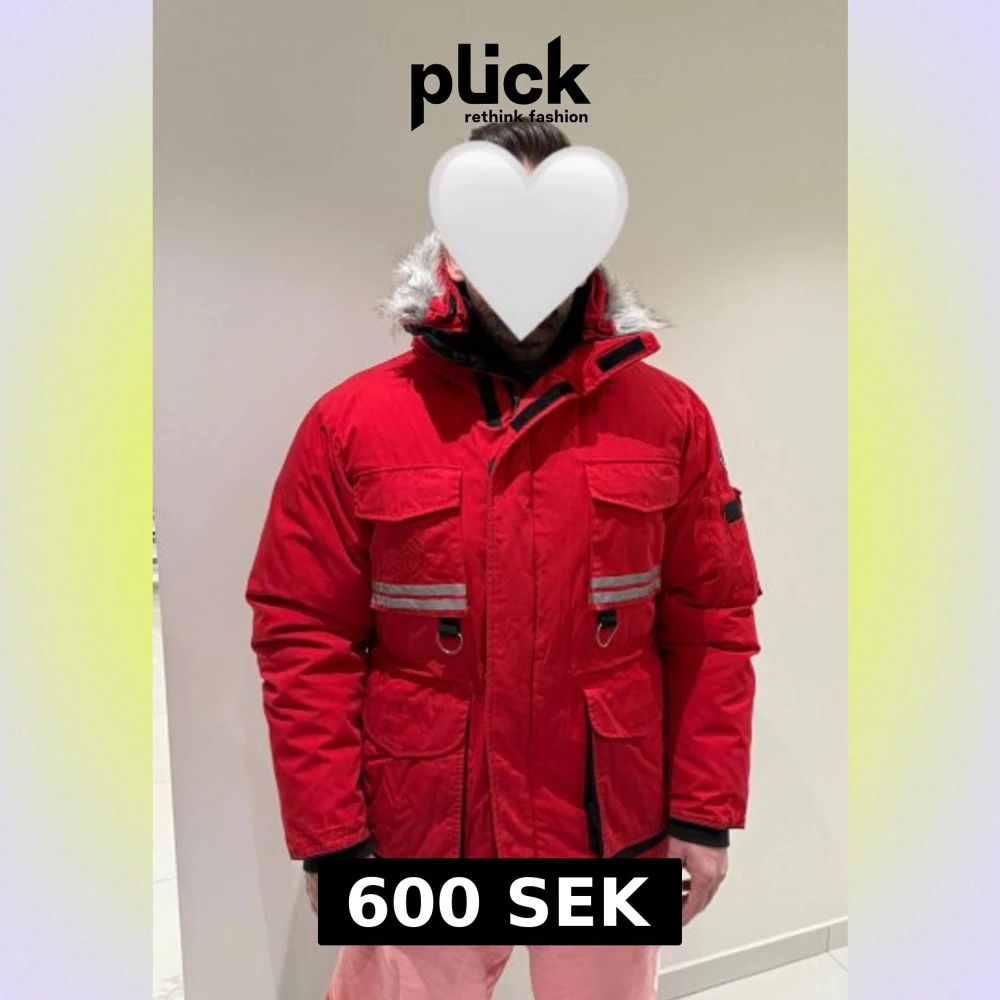 Röd parkas från First Slope Expedition med reflexdetaljer, flera stora fickor och huva med fuskpäls. Jackan har svart innerfoder med stort tryck, justerbar midja och dragkedja framtill. Perfekt för kalla vinterdagar och riktigt snygg streetstil.