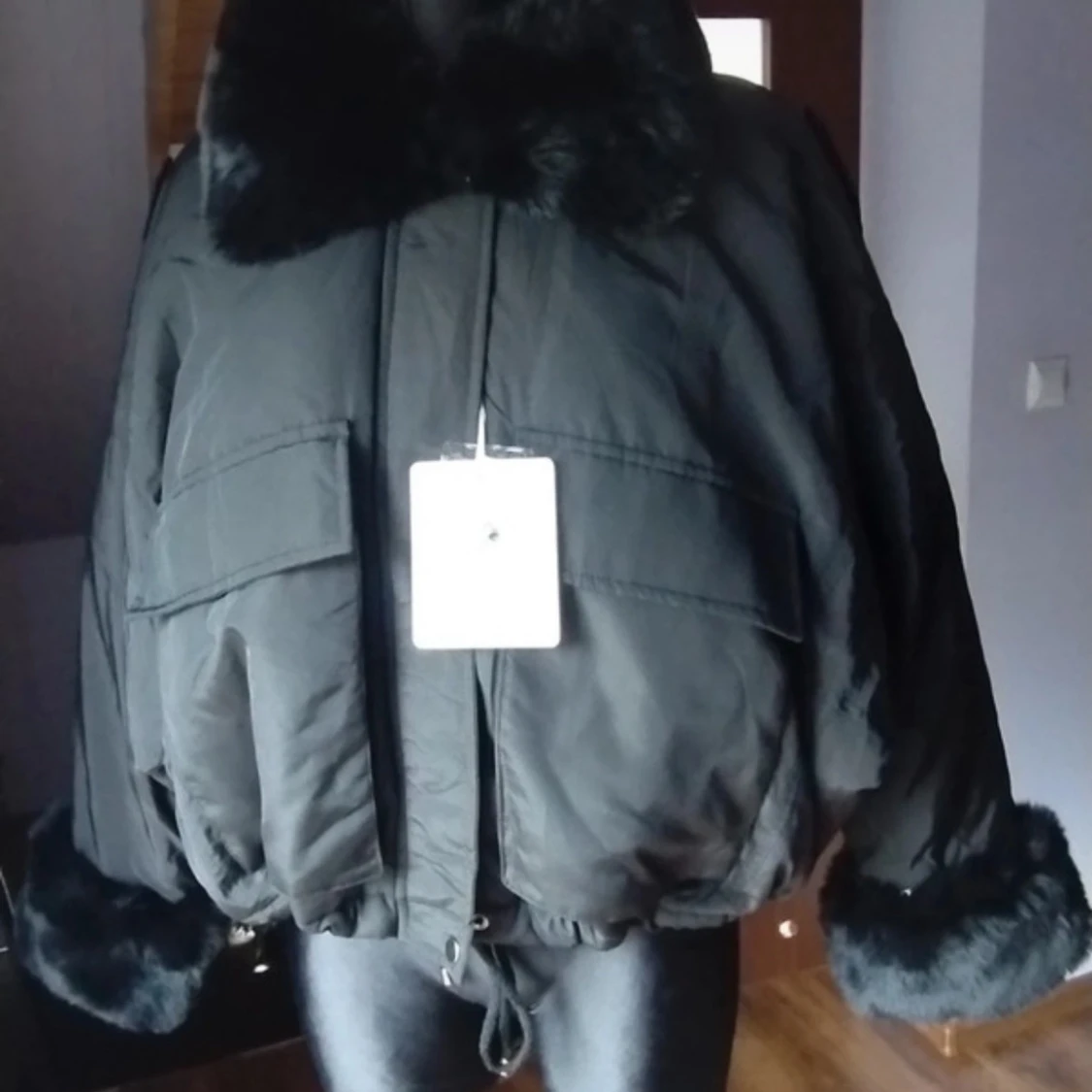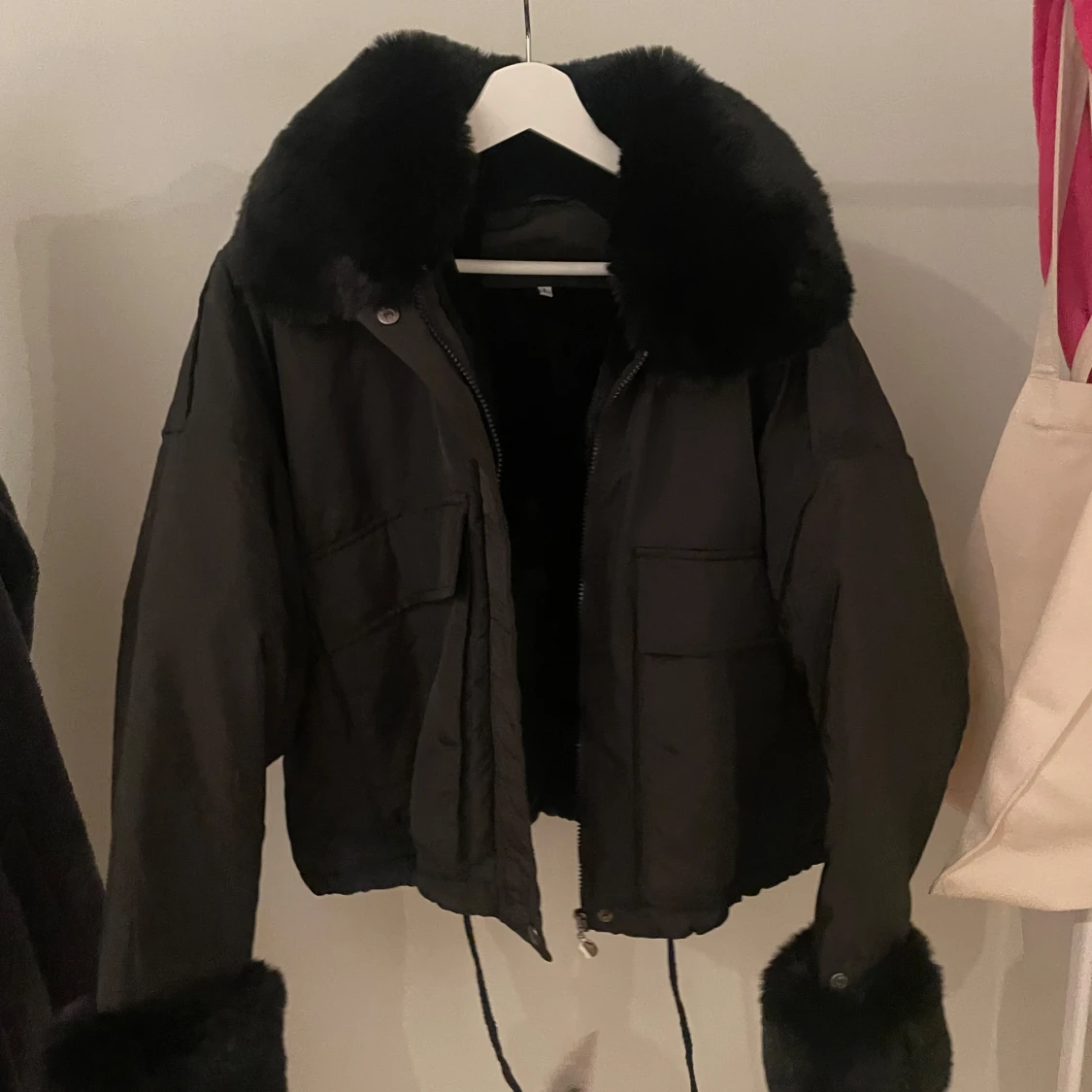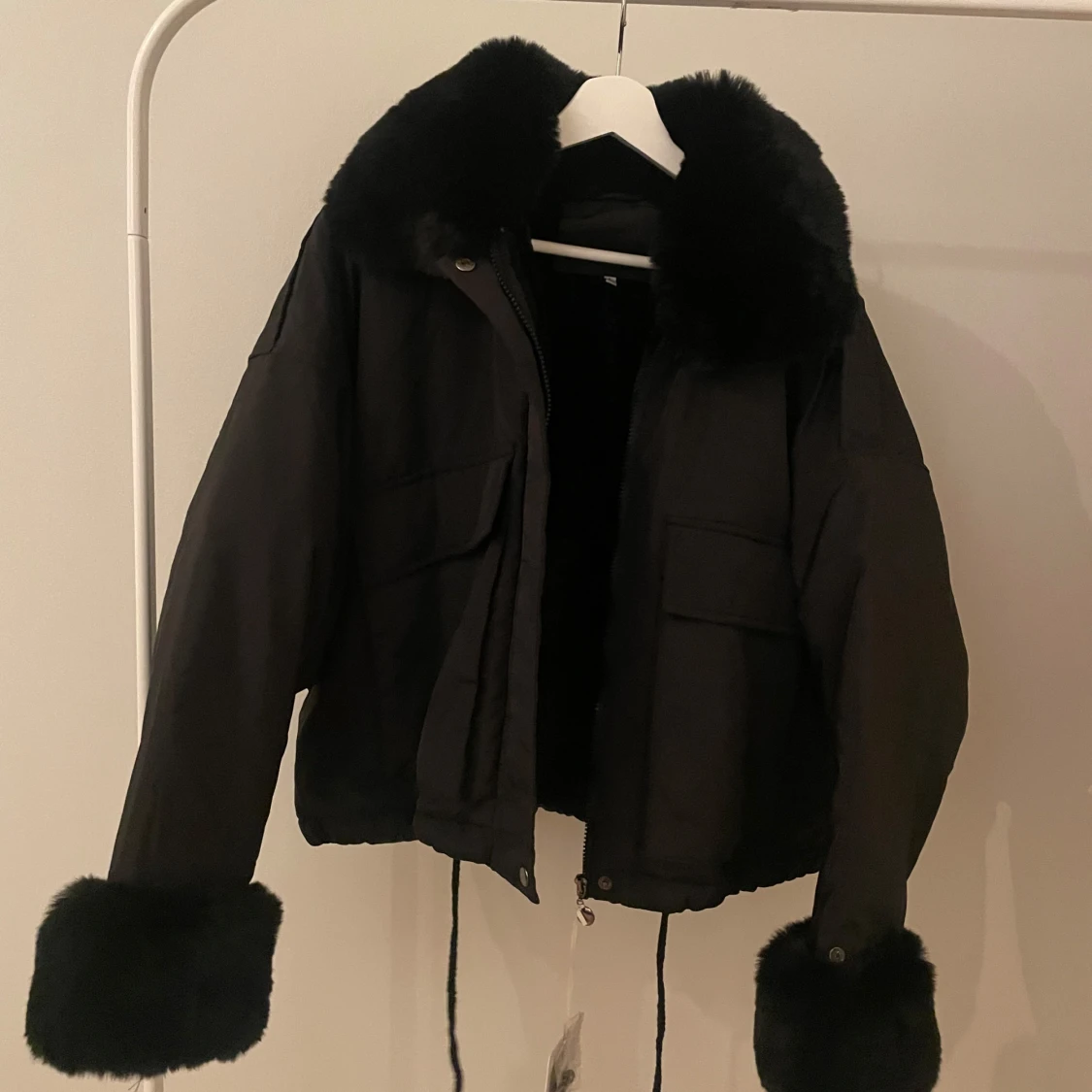 Snygg svart jacka med fluffiga pälsdetaljer på krage och ärmslut. Jackan har en dragkedja framtill och två stora fickor. Perfekt för kyliga dagar när du vill hålla stilen.