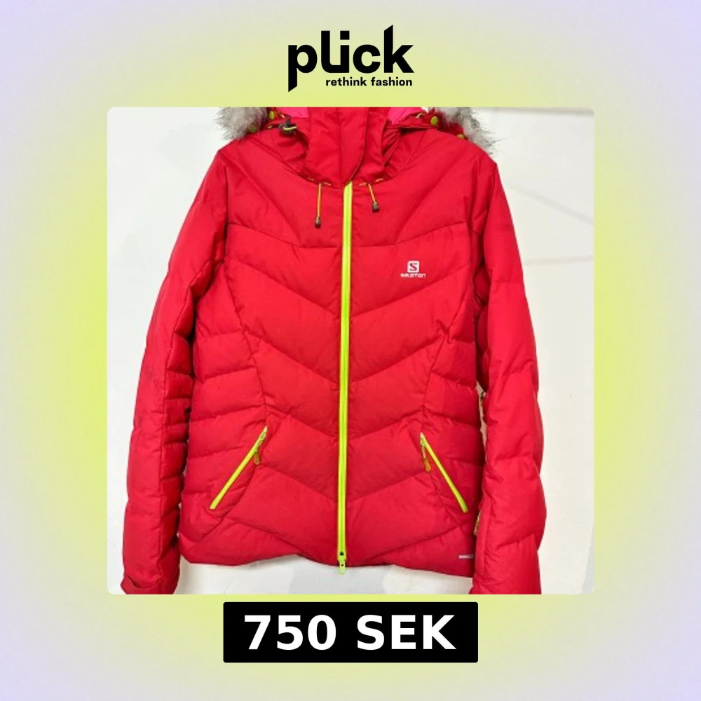 Riktigt snygg röd dunjacka från Salomon med limegröna dragkedjor och huva med fuskpäls. Jackan har två fickor framtill, justerbar huva och coolt mönstrad sömnad. Perfekt för kalla dagar när du vill sticka ut lite extra.
