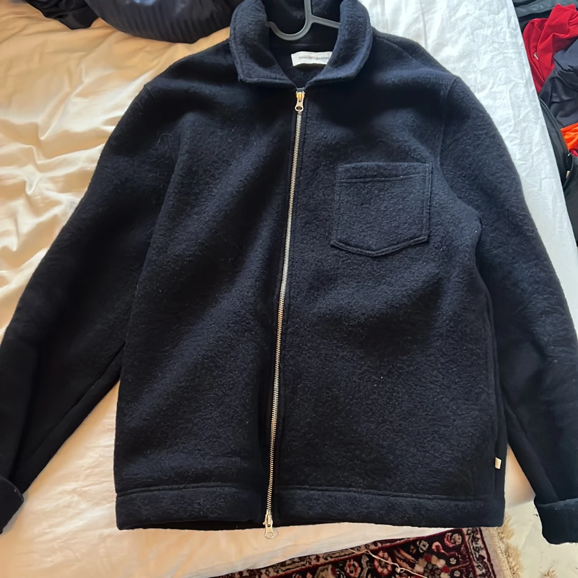 Stilren svart overshirt från Samsoe Samsoe med rak passform, klassisk krage och bröstficka. Jackan har en grov dragkedja framtill och är tillverkad i mjuk ullblandning. Perfekt för lager-på-lager och enkel att matcha med olika outfits.