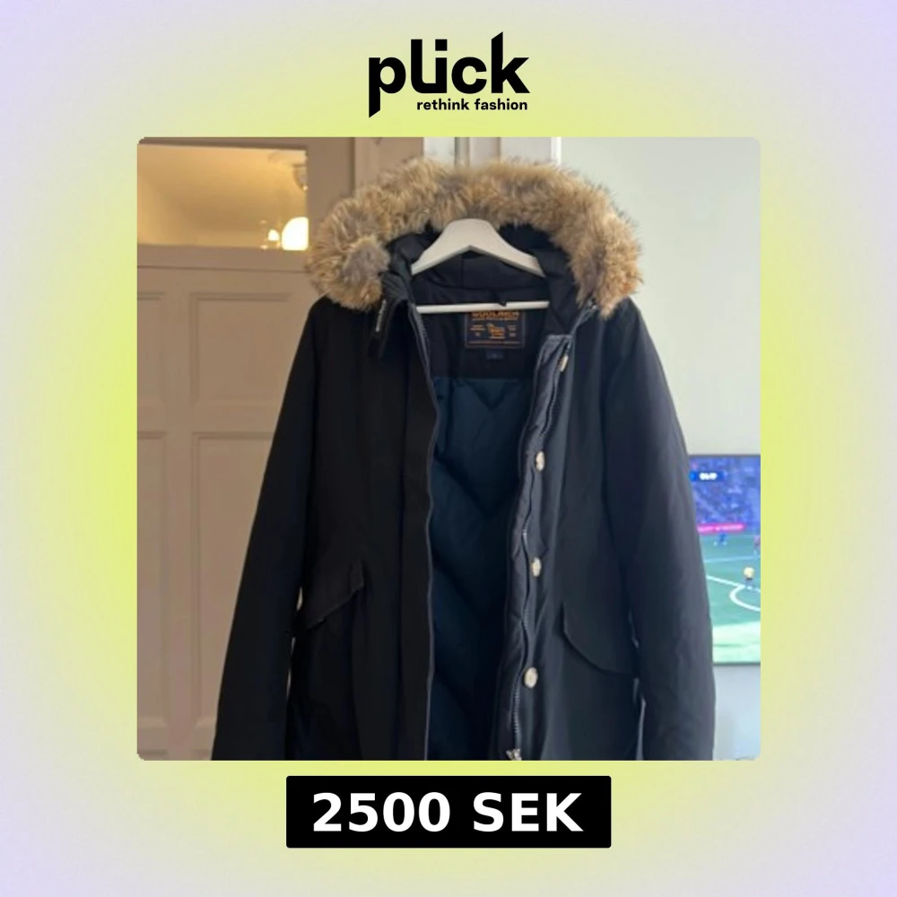 Säljer en svart parkas från Woolrich med stor fluffig pälskrage i beige och grå toner. Jackan har dragkedja och knappar framtill, stora fickor och är fodrad för extra värme. Perfekt för kalla dagar och riktigt snygg streetstil. Passar storlek 38. Avtag bar päls