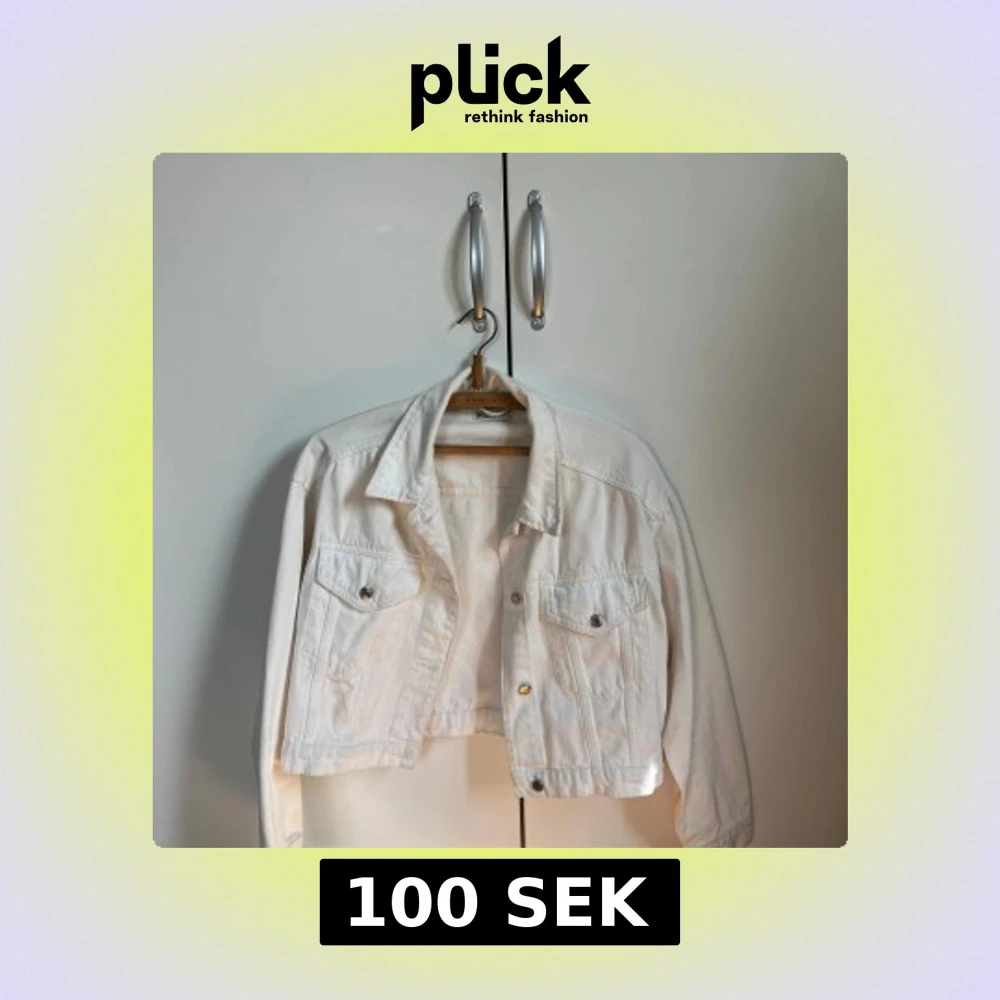 Snygg vit croppad jeansjacka med klassisk krage och två bröstfickor med knappar. Jackan har långa ärmar och silverfärgade knappar framtill. Använd 2-3 gånger, inköpt från Gina tricot