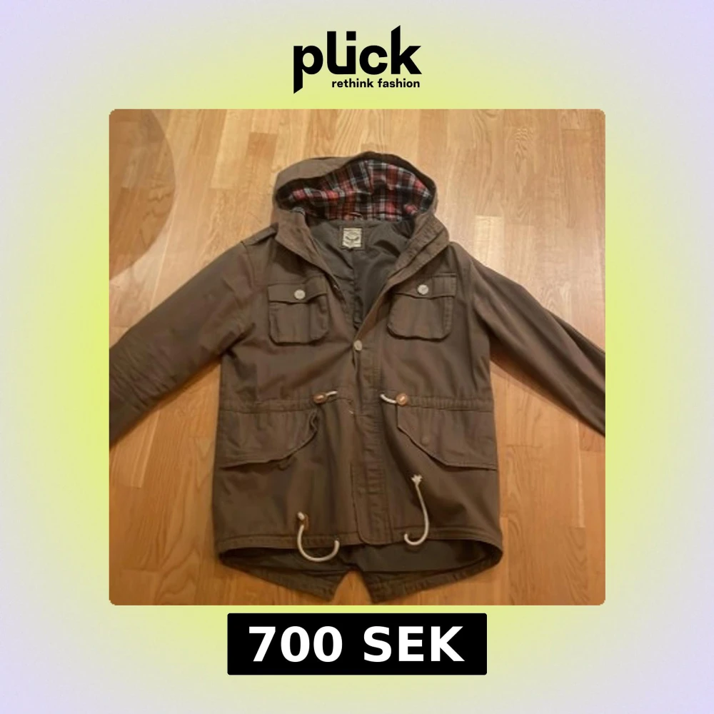 Säljer en brun jacka från Brave Soul med rutigt foder och huva. Jackan har knappar och dragsko i midjan för justerbar passform. Perfekt för höst och vår. Jackan har ett bra skick bara att två knappar saknas men 1 finns kvar.