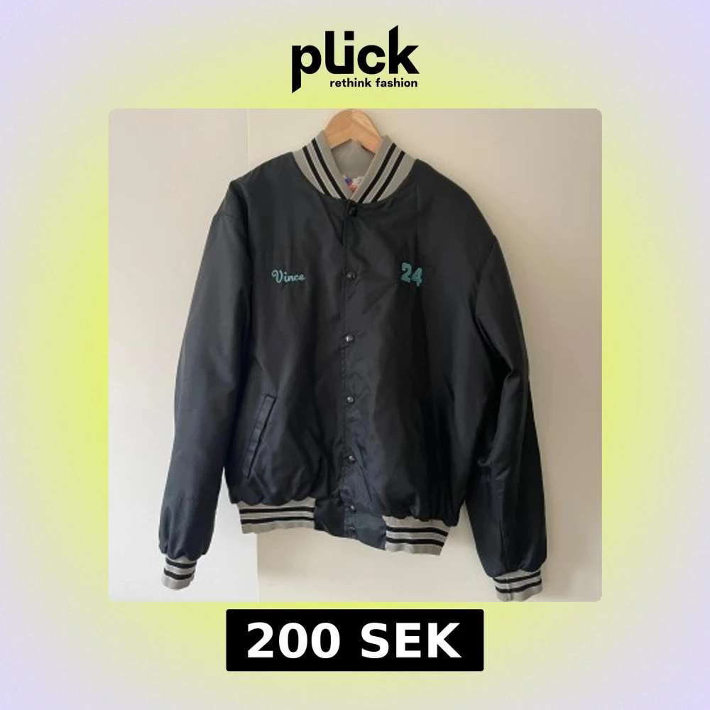 Retro svart bomberjacka från Rennoc med broderad text 'Vince' och siffran 24 på bröstet. Jackan har grå- och svart-randiga muddar, knäppning med svarta knappar och två fickor. Insidan är quiltad i vitt för extra komfort. Perfekt för dig som gillar sportig vintage vibe.