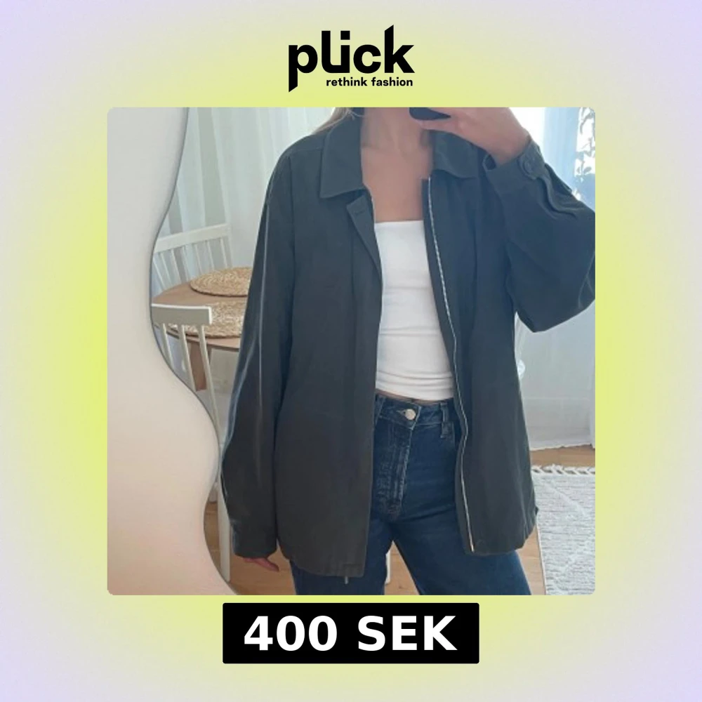 Riktigt snygg mörkgrön jacka med vintage look. Mockainspirerad. Oklart vilken storlek men den ger en oversized look på mig som är 176 (36,38 vanligtvis). Liten fläck bak på axeln men inget som varit märkbart när jag använt den.