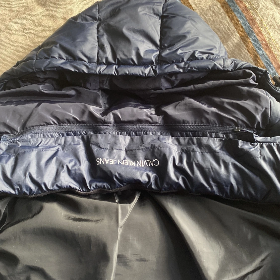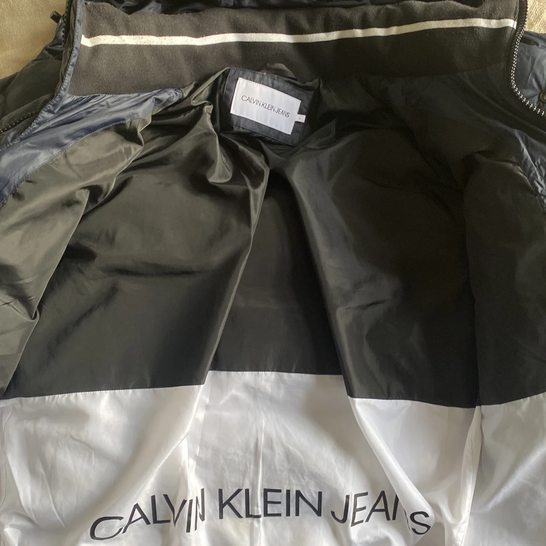 Säljer en calvin klein jacka som är i helt nytt skick förutom lite smuts på insidan av jackan som inte styns när den är på.