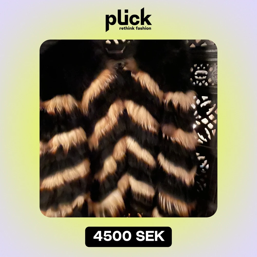 Säljer en lyxig och elegant pälsjacka från Diane von Furstenberg i svart och beige. Jackan är gjord av äkta rävpäls och har ett unikt mönster som verkligen sticker ut. Perfekt för att hålla sig varm och stilren under kyliga dagar.