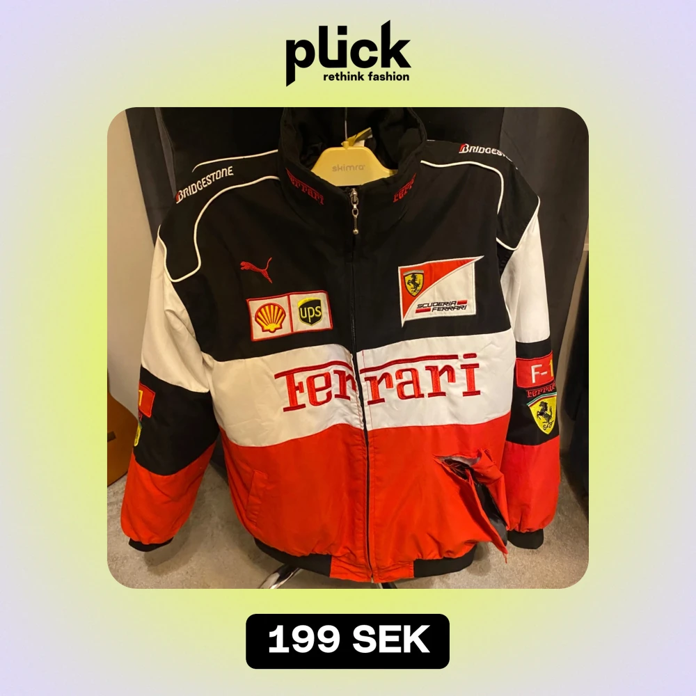 Snygg Ferrari jacka i svart, rött och vitt med flera broderade loggor som Shell och UPS. Jackan har dragkedja och är långärmad med en cool racingstil. Perfekt för bilentusiaster!