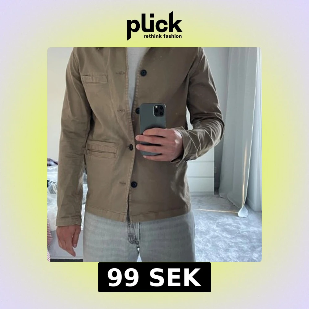 Säljer en beige overshirt från Selected Homme i bomull. Jackan har klassisk krage, knäppning framtill med svarta knappar och flera fickor. Perfekt för lager-på-lager och enkel att styla till jeans eller chinos.