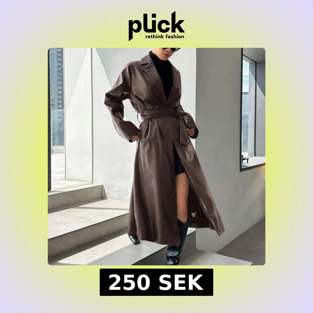 Snygg lång brun trenchcoat i skinnimitation med bälte i midjan och breda slag. Jackan har långa ärmar med knäppning vid ärmslut och en stilren, minimalistisk look. Perfekt för dig som vill sticka ut med en trendig och edgy vibe.