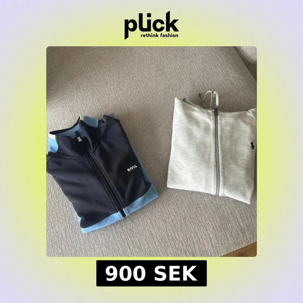 Två snygga zipjackor, en i svart och ljusblå från Boss och en i ljusgrå från Polo Ralph Lauren. Båda har dragkedja framtill och hög krage.