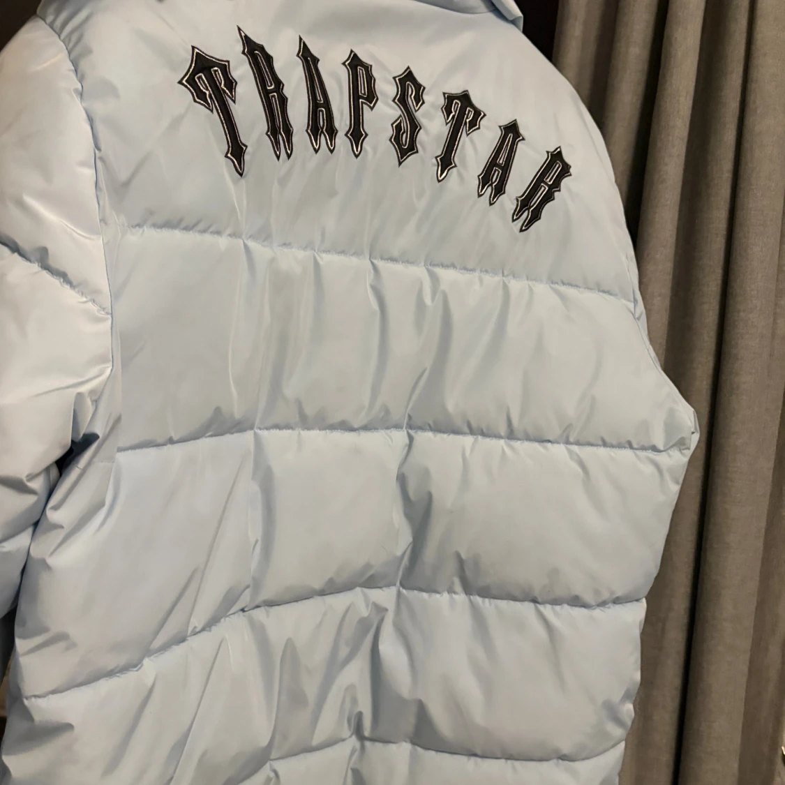 Säljer en ljusblå pufferjacka från Trapstar med stor logga broderad på ryggen och rund patch på bröstet. Jackan har dragkedja framtill, hög krage och vadderad design som håller dig varm. Perfekt för dig som vill sticka ut med streetwear-vibe. Hör av dig om du har några frågor.