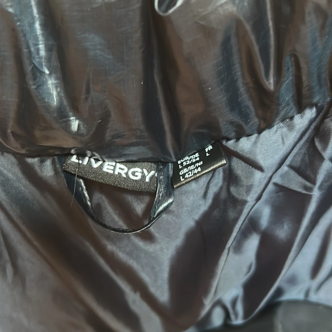 Säljer en svart pufferjacka från Livergy i storlek L. Jackan har glansig finish, horisontella sömmar och dragkedja framtill. Helt ny aldrig använt