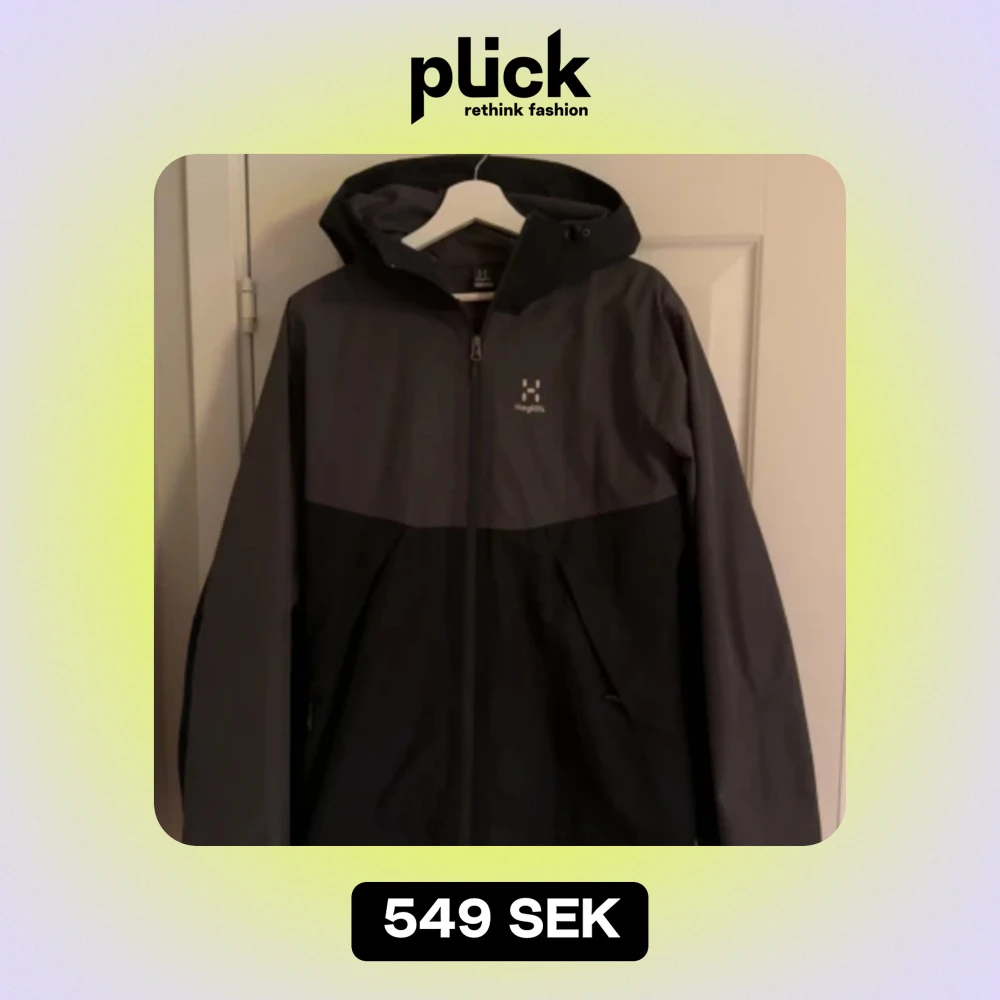 Gråsvart Haglöfs jacka som är vind- och vattentät. Inga fläckar eller hål. Storlek S men är väldigt stor i storleken, passar mig som vanligtvis har storlek L och är 190cm, ca 70kg. Finns spännen så man kan justera passform. Inget kvitto kvar tyvärr.