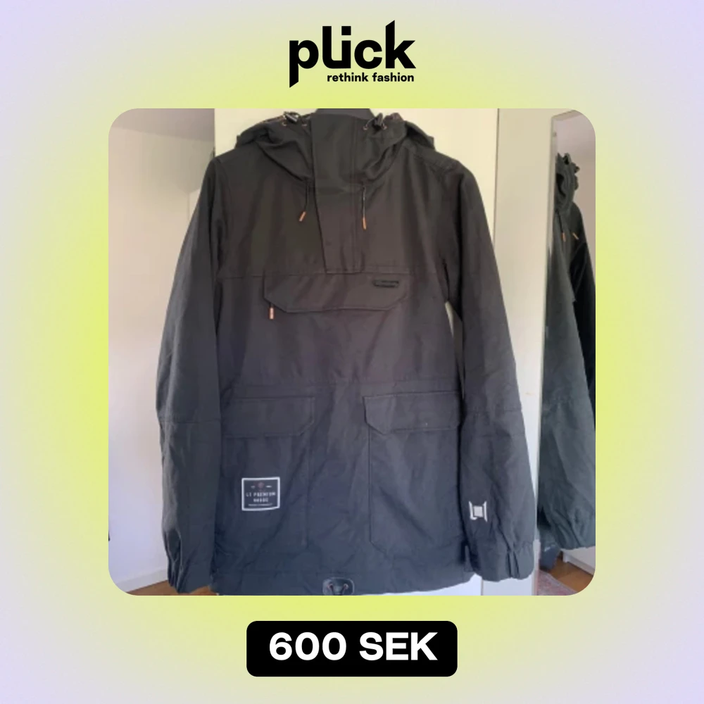 Svart oversized anorakjacka med huva och en ficka på bröstet. Det finns även fler fickor för förvaring. Jackan är använd som skidjacka, men har inga tydliga tecken på slitage.