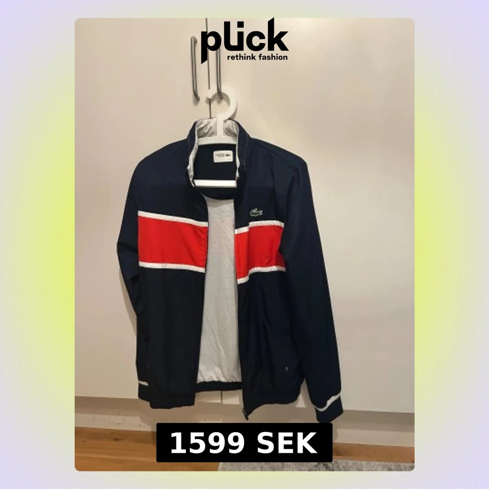 Snygg vindjacka från Lacoste i mörkblått med bred röd och vit rand över bröstet och ryggen. Jackan har dragkedja, ståkrage och en röd huva som kan vikas in. Klassisk krokodillogga på bröstet och elastiska muddar vid ärmslut och nederkant. Perfekt för dig som gillar sportig stil.