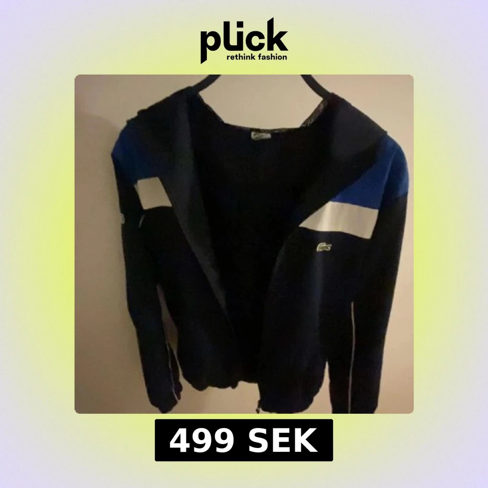 Säljer en blå vindjacka från Lacoste med vit och blå panel upptill samt dragkedja framtill. Jackan har huva och två sidofickor. Klassisk Lacoste-logga på bröstet och sportig design.