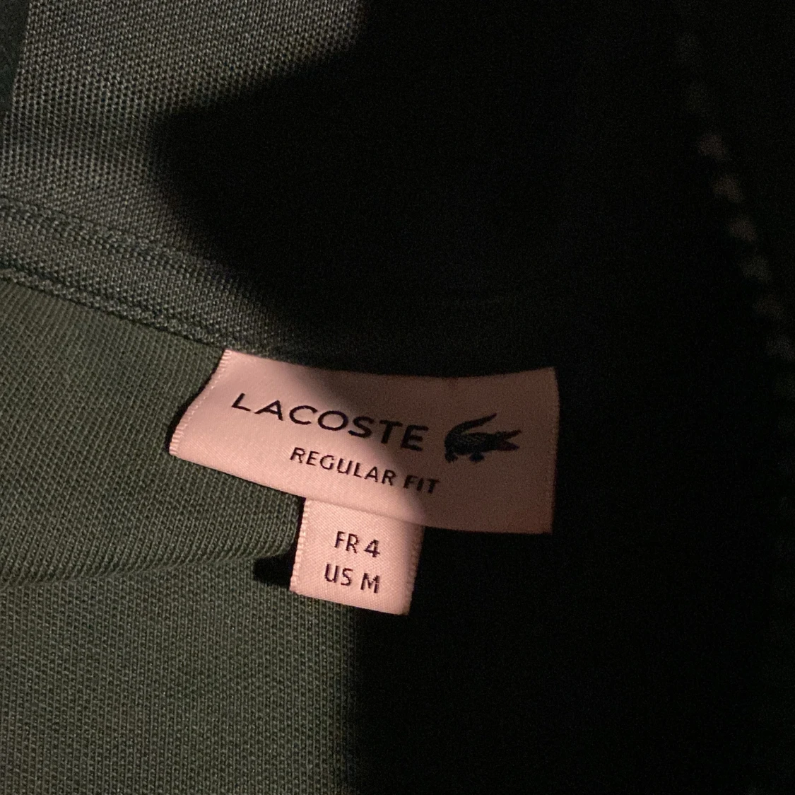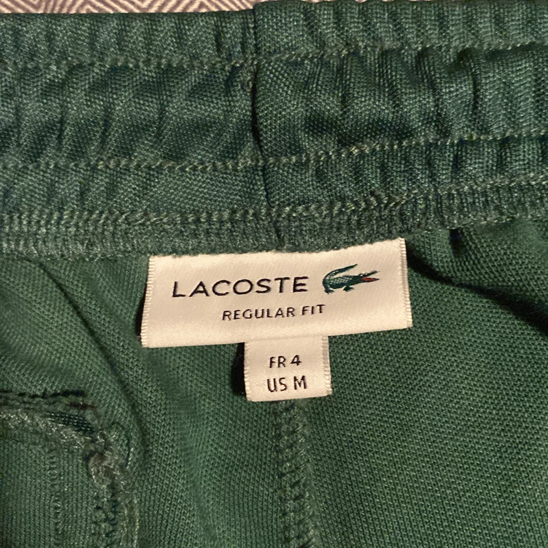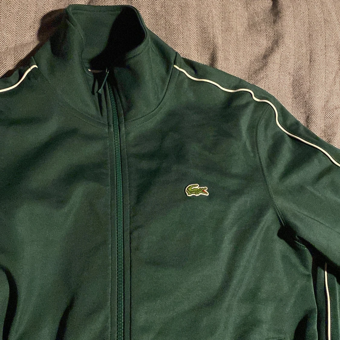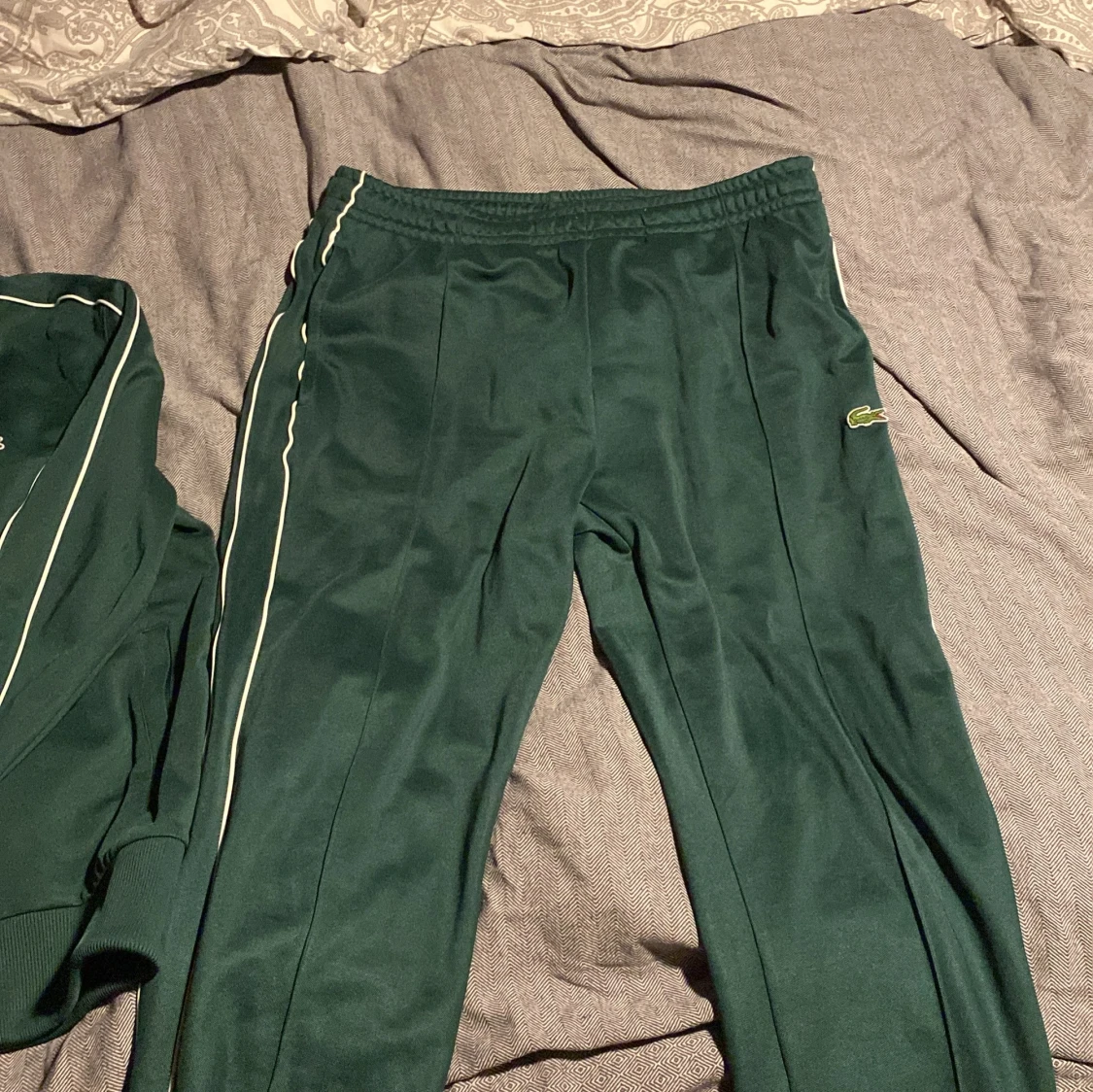 Säljer en grön träningsdräkt från Lacoste i regular fit. Setet består av en jacka med dragkedja och matchande byxor. Båda delarna har vita detaljer längs ärmar och ben. Perfekt för en sportig look🐊