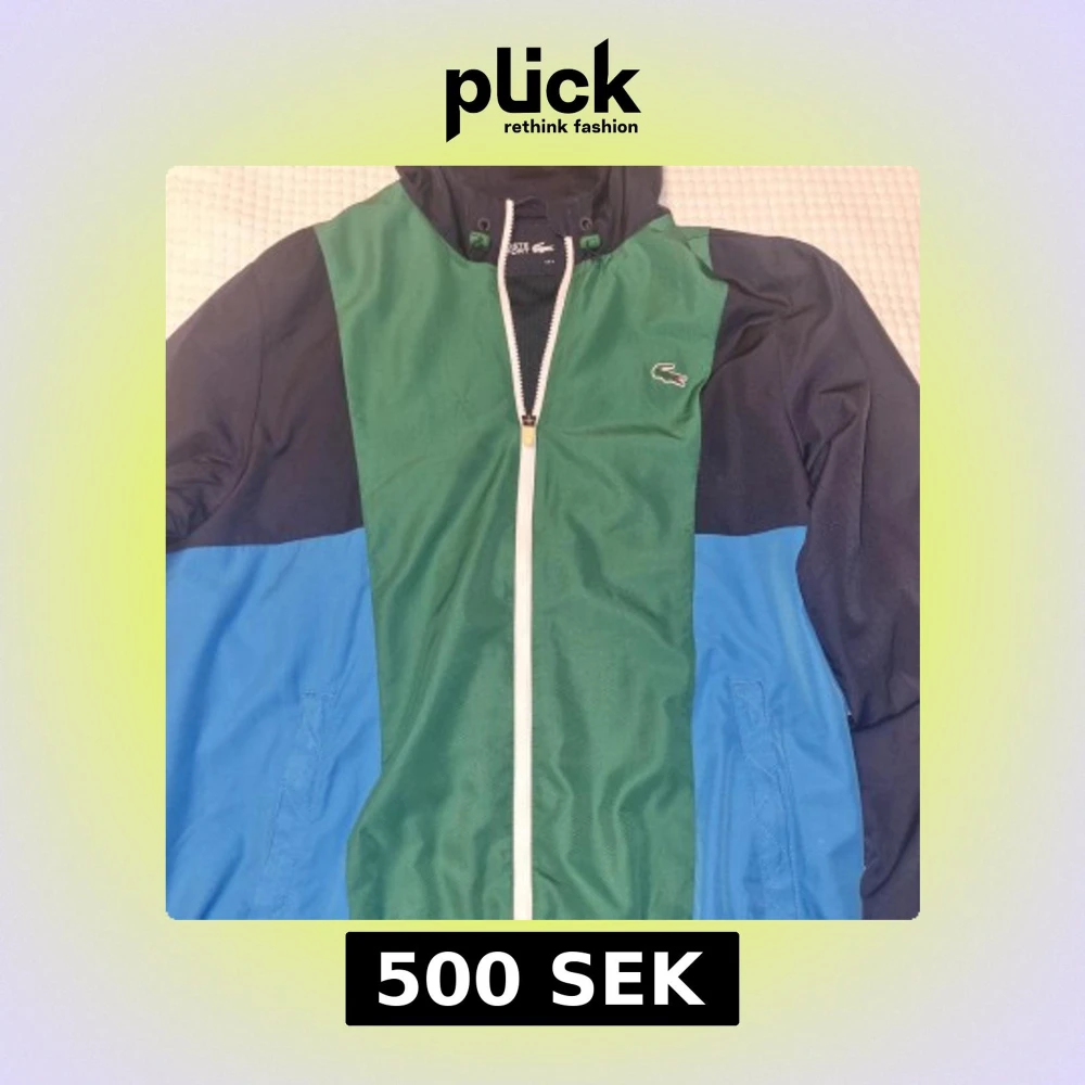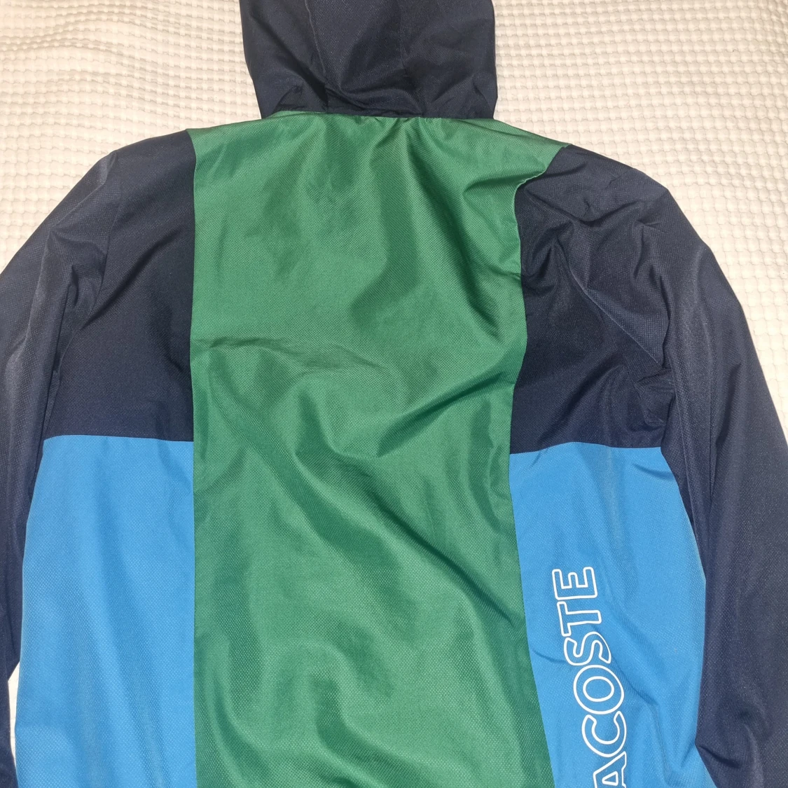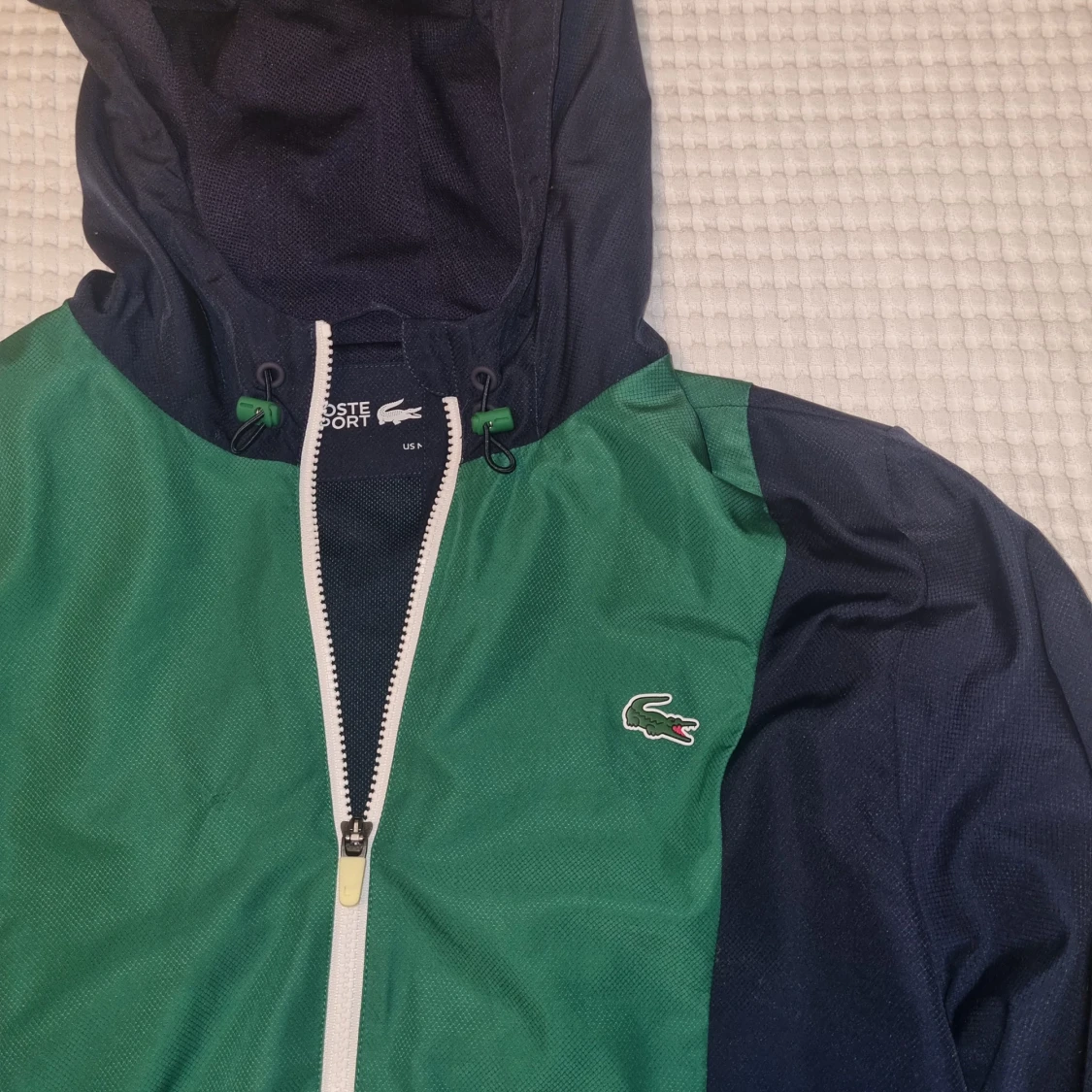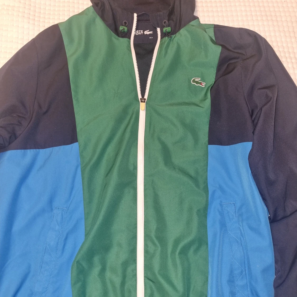 Vindjacka från Lacoste i grönt och blått. Jackan har en dragkedja framtill och en huva med snörning.