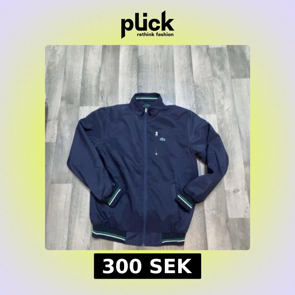 Snygg mörkblå vindjacka från Lacoste med klassisk krokodillogga på bröstet. Jackan har dragkedja framtill, ribbade muddar med gröna och vita ränder samt hög krage med broderad Lacoste-text. Perfekt för dig som gillar sportig och stilren look.