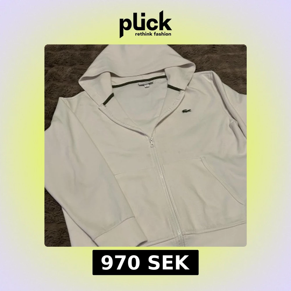 Säljer en stilren vit huvtröja från Lacoste med dragkedja och broderad logga på bröstet. Tröjan har långa ärmar och en bekväm huva med gröna detaljer. Perfekt för en avslappnad look.