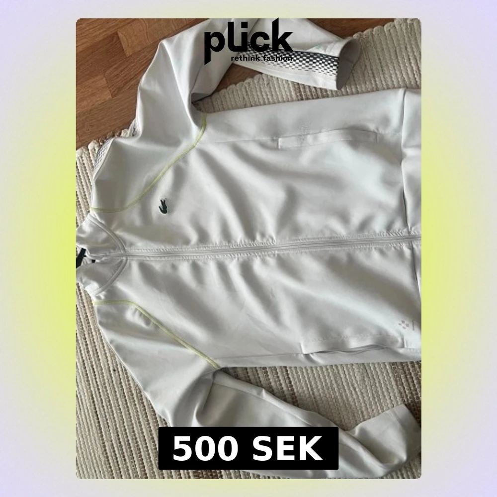 Sportig vit vindjacka från Lacoste med dragkedja framtill och diskret logga på bröstet. Jackan har lång ärm, tunna gröna detaljer och ett rutigt band på insidan av ena ärmen. Perfekt för en avslappnad och stilren look.