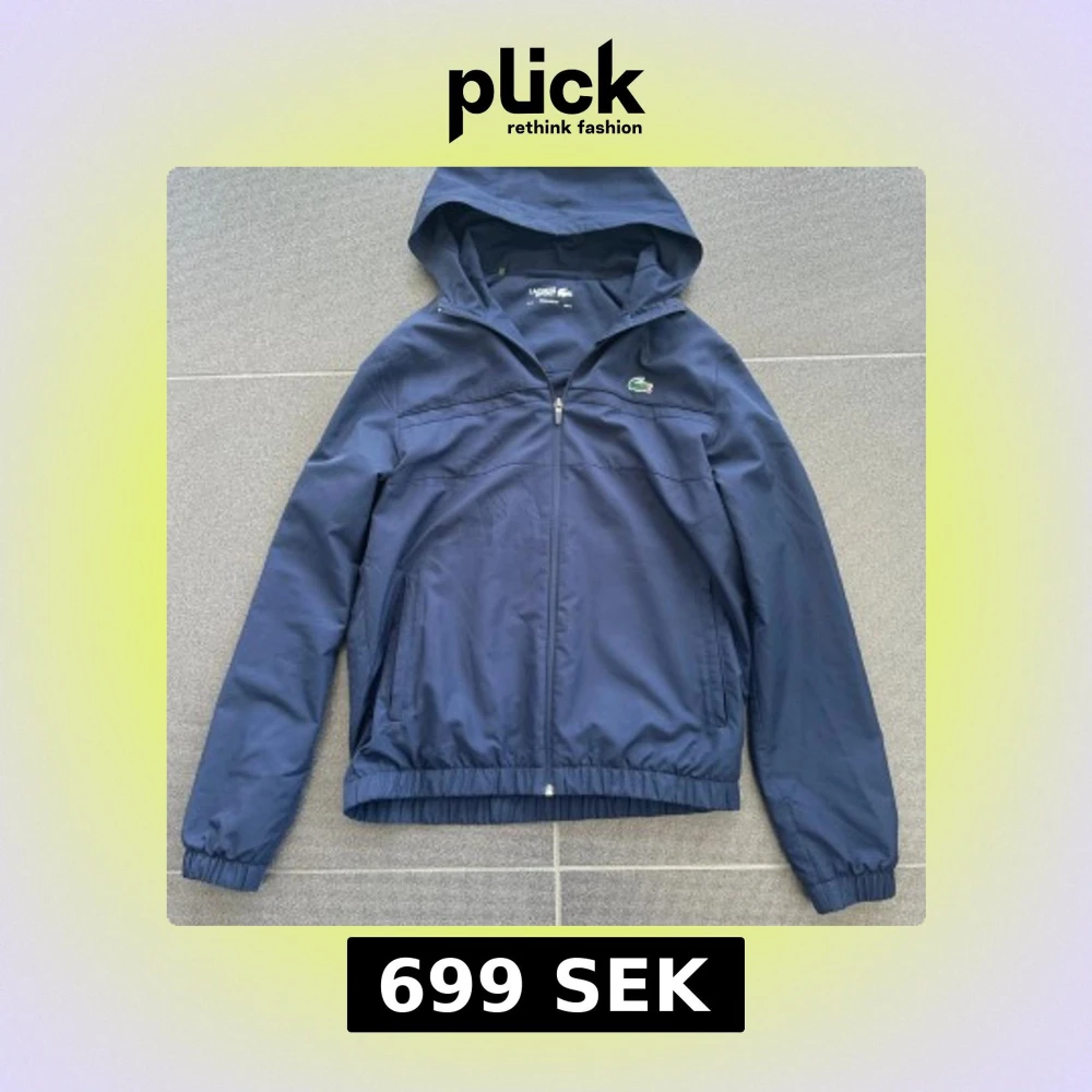 Snygg marinblå vindjacka från Lacoste Sport med huva och dragkedja framtill. Jackan har elastiska muddar, två fickor och klassisk krokodillogga på bröstet. Tillverkad i 100% polyester med meshfoder för extra komfort. Perfekt för dig som gillar sportig och clean stil. Har dock ett litet hål vid armen men ska laga det!