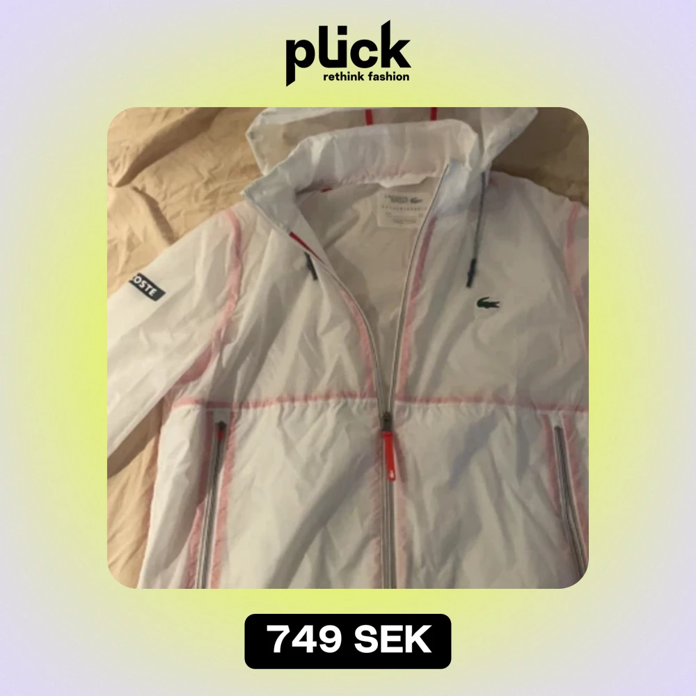 En vit/röd lacoste vindjacka som är i ny skick. Den köptes mindre än 4 månader sen och har nästan aldrig använts.