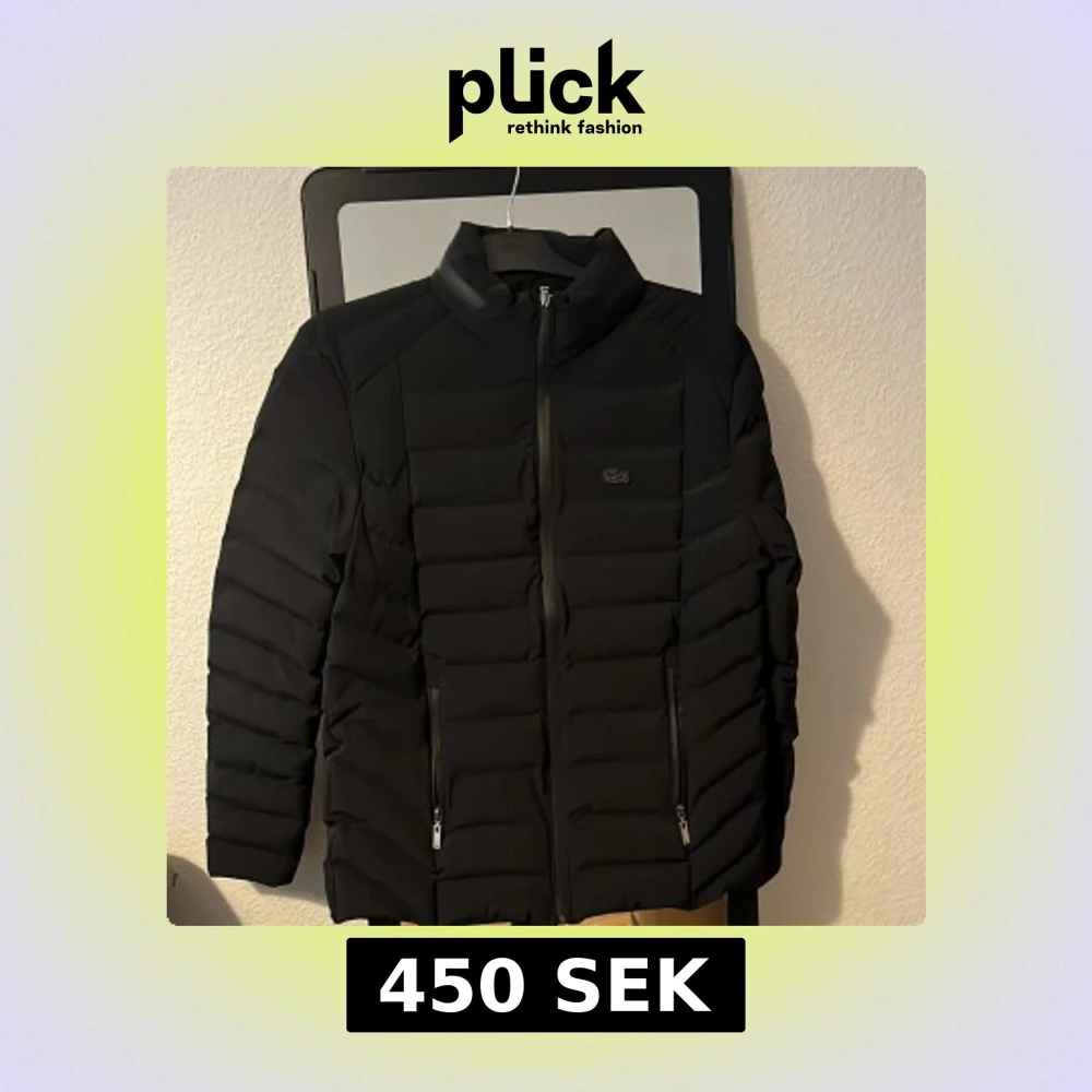 Säljer en svart pufferjacka från Lacoste med diskret krokodillogga på bröstet. Jackan har hög krage, två fickor med dragkedja och quiltad design. Materialet är syntet och polyester, perfekt för kyliga dagar. Stängs med dragkedja framtill.