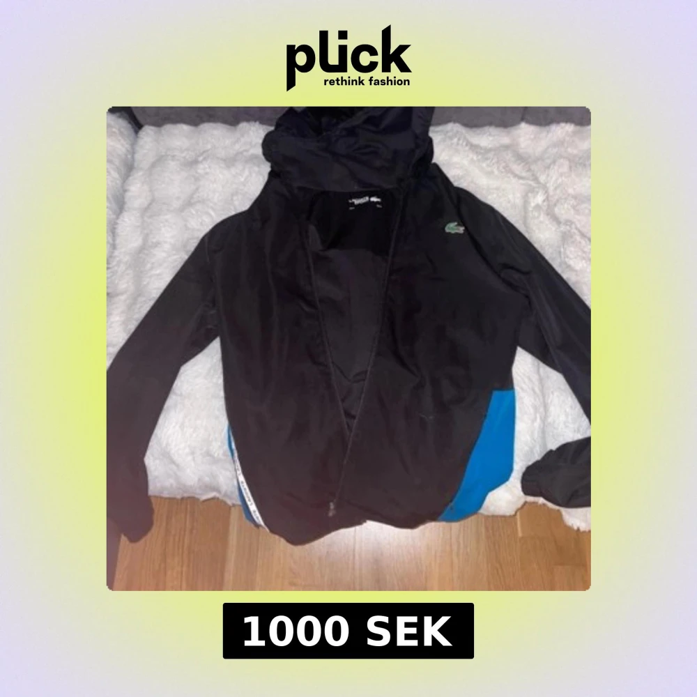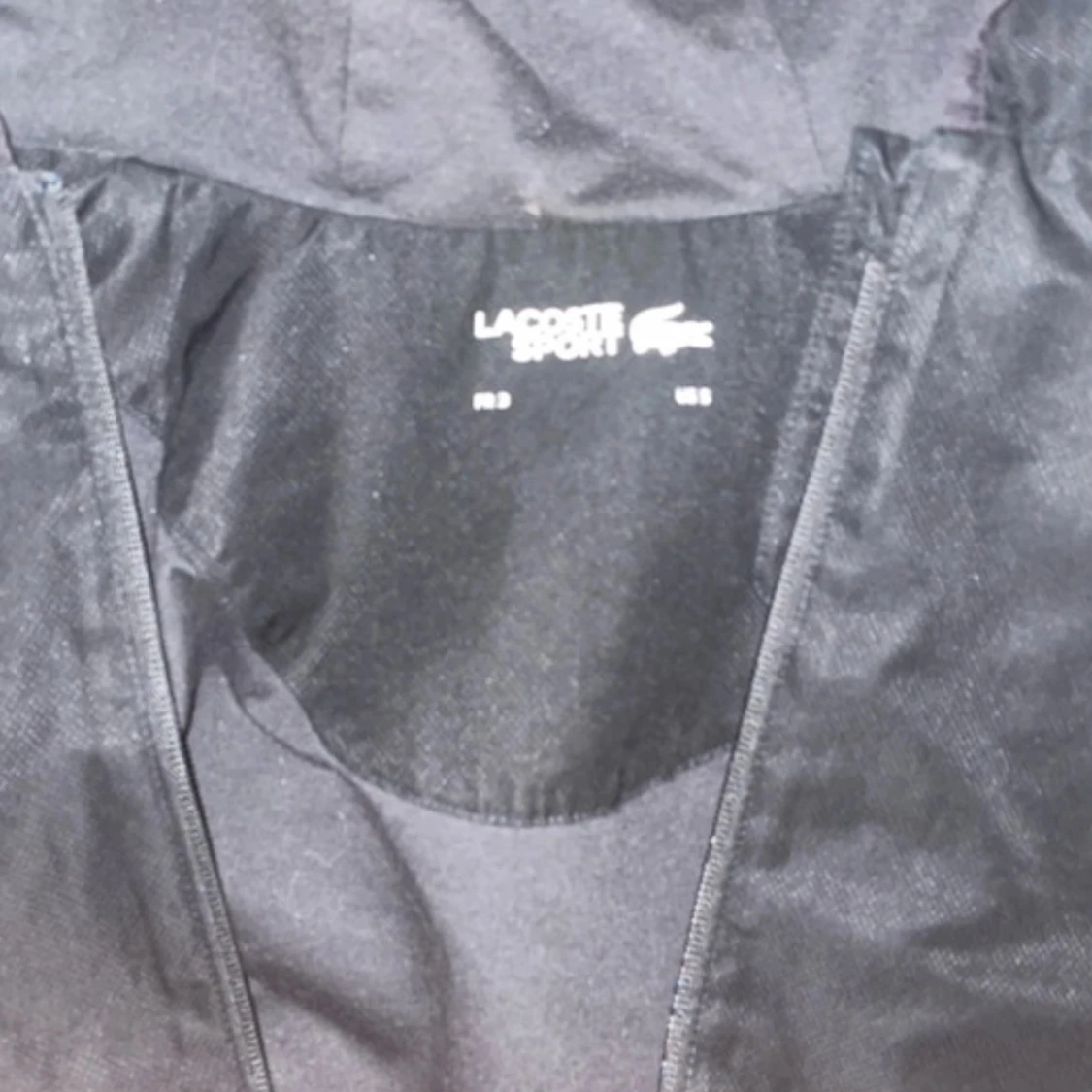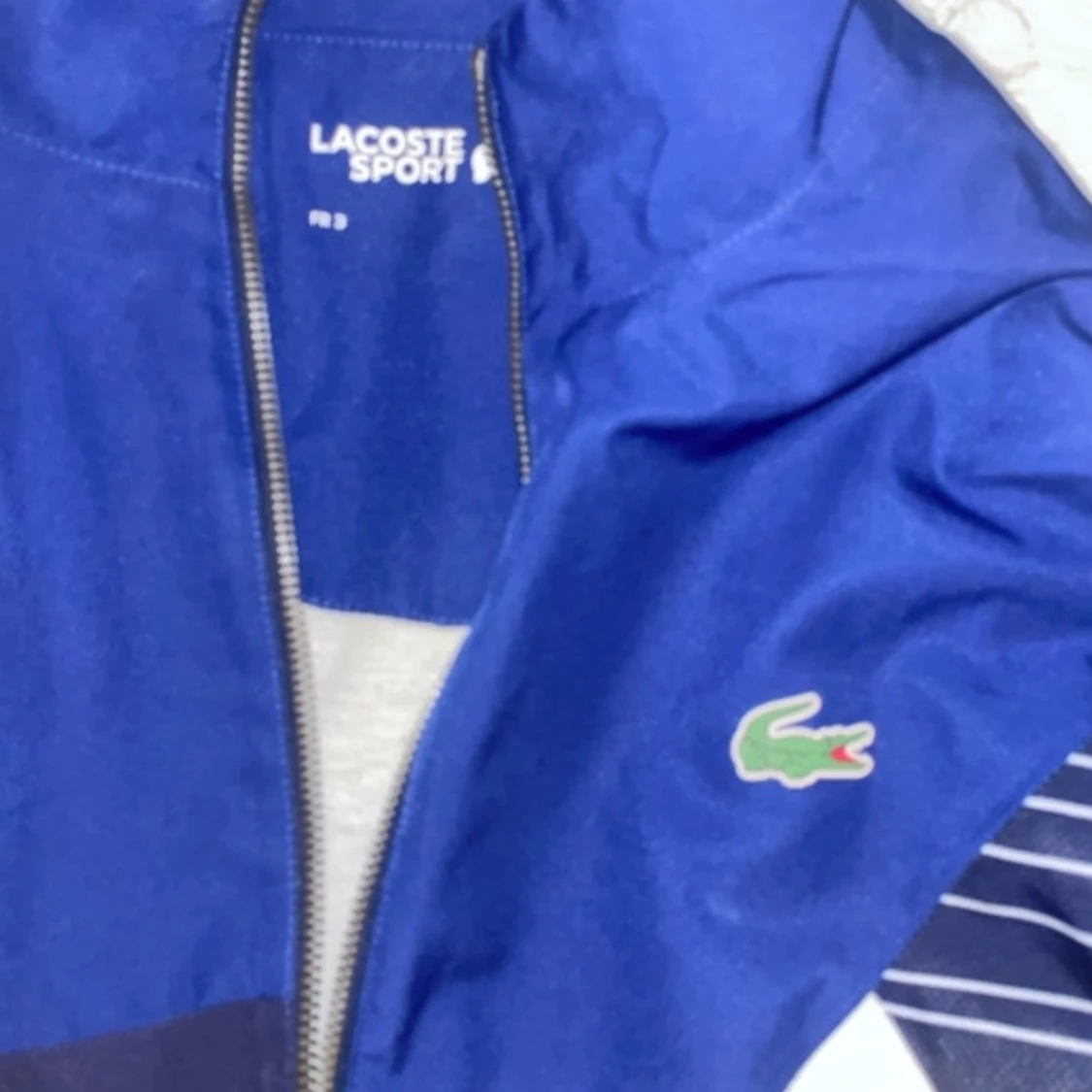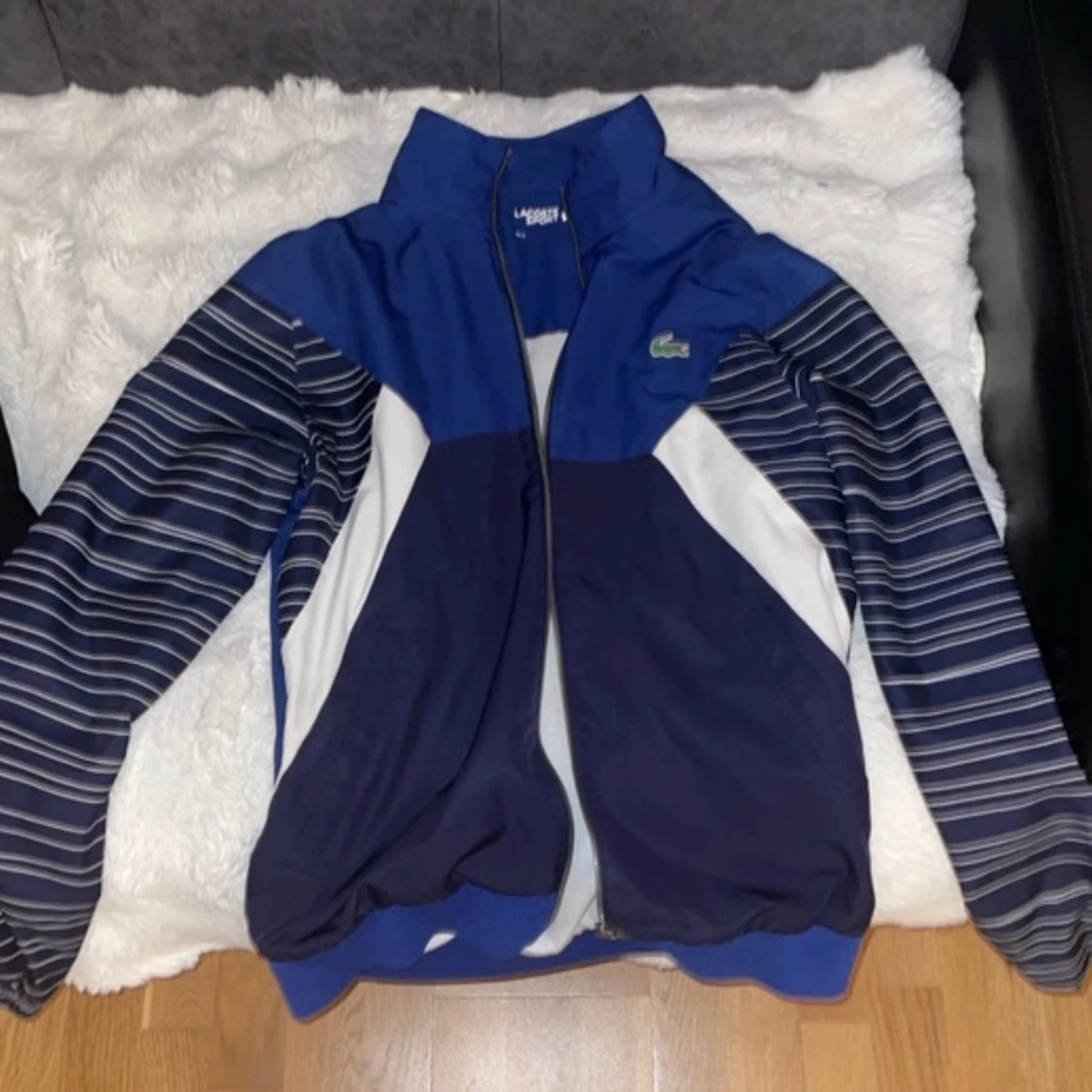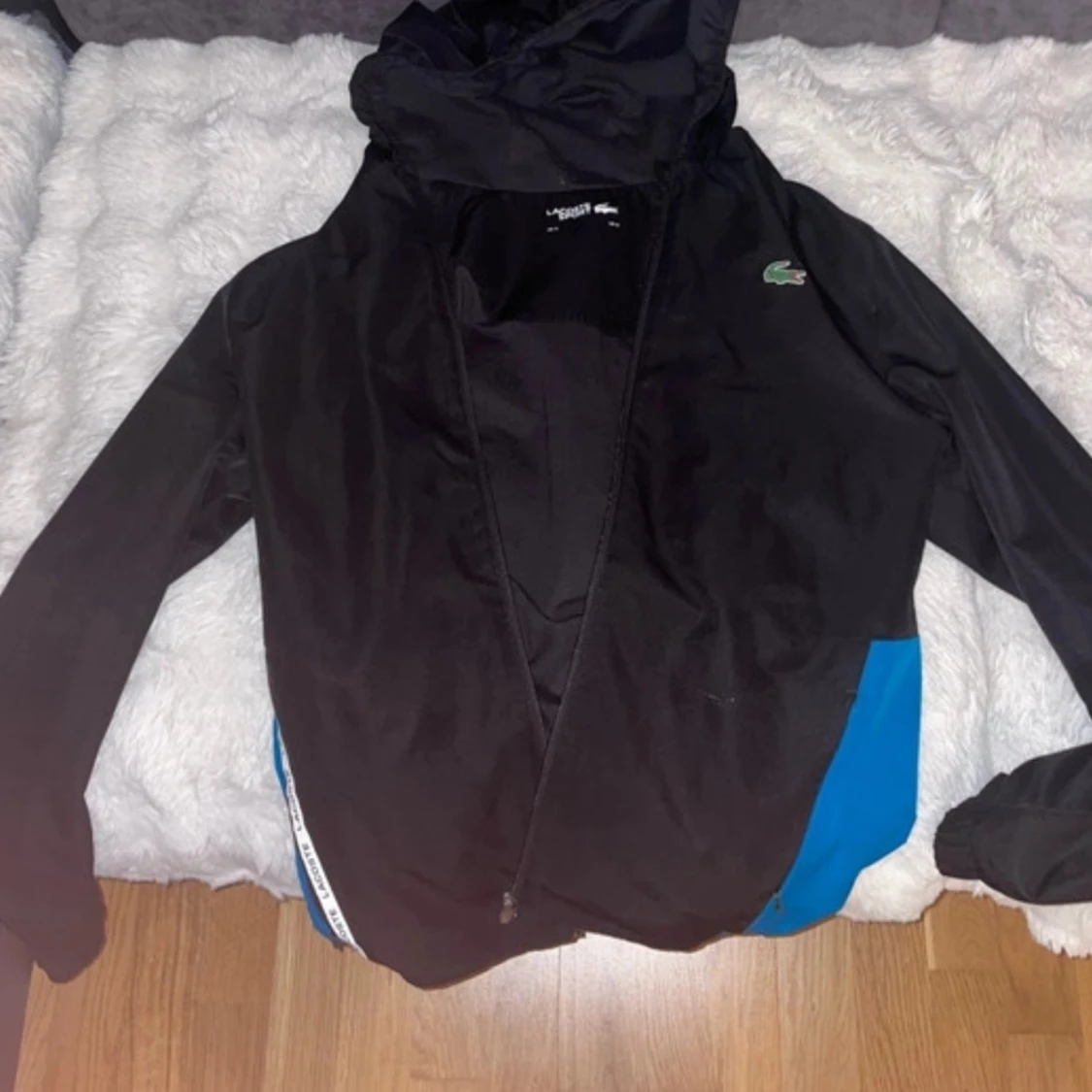 Säljer en snygg svart och blå vindjacka från Lacoste. Jackan har dragkedja och långa ärmar med randigt mönster. Perfekt för sportiga aktiviteter och har en cool design med vita detaljer.