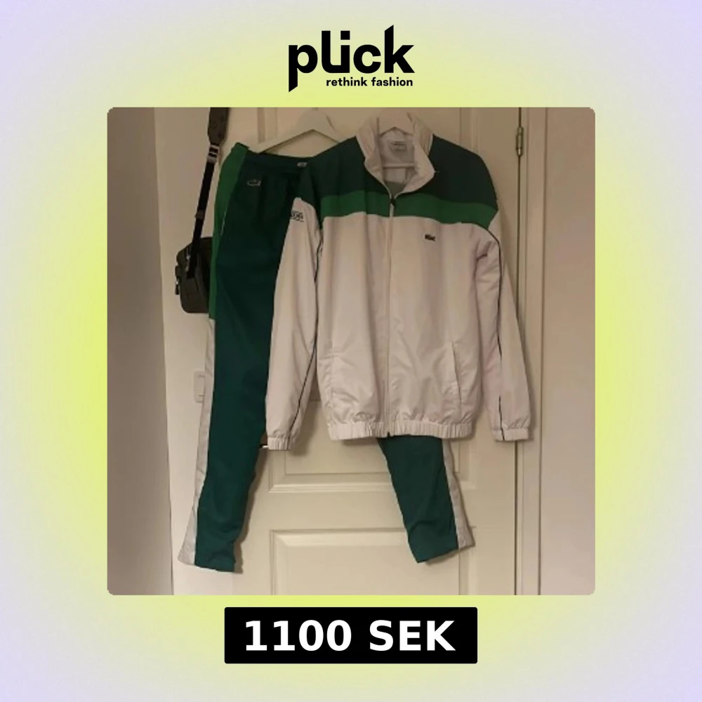 BEHÖVER PENGAR AKUT!!Säljer en stilren vit och grön träningsdräkt från Lacoste. Säljer den åt min vän han sa att fick den av sin kusin. Jackan har dragkedja och elastiska muddar, medan byxorna har en bekväm resår i midjan. Perfekt för sportiga aktiviteter eller en avslappnad stil.