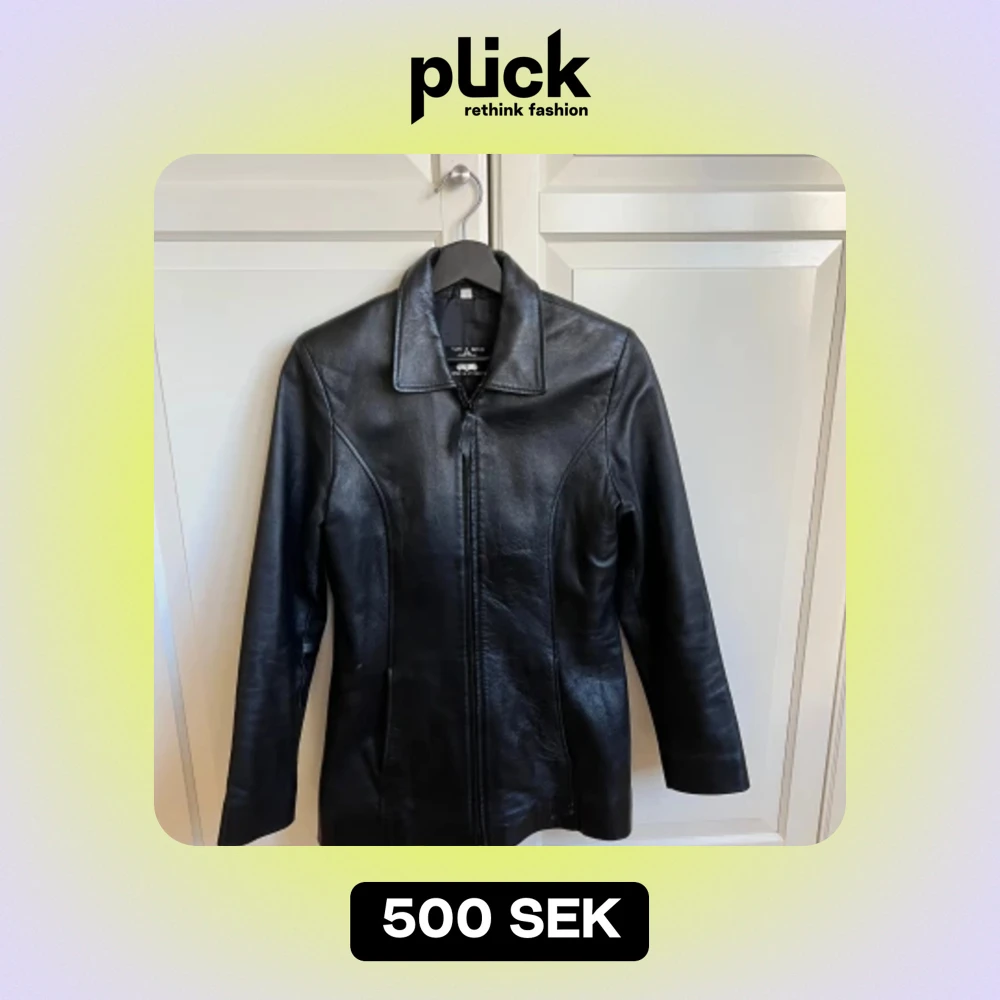 Svart läderjacka i mycket gott skick. Det finns en liten skada, se sista bilden. Det står att den är strl L men skulle nog snarare säga att det är en strl M